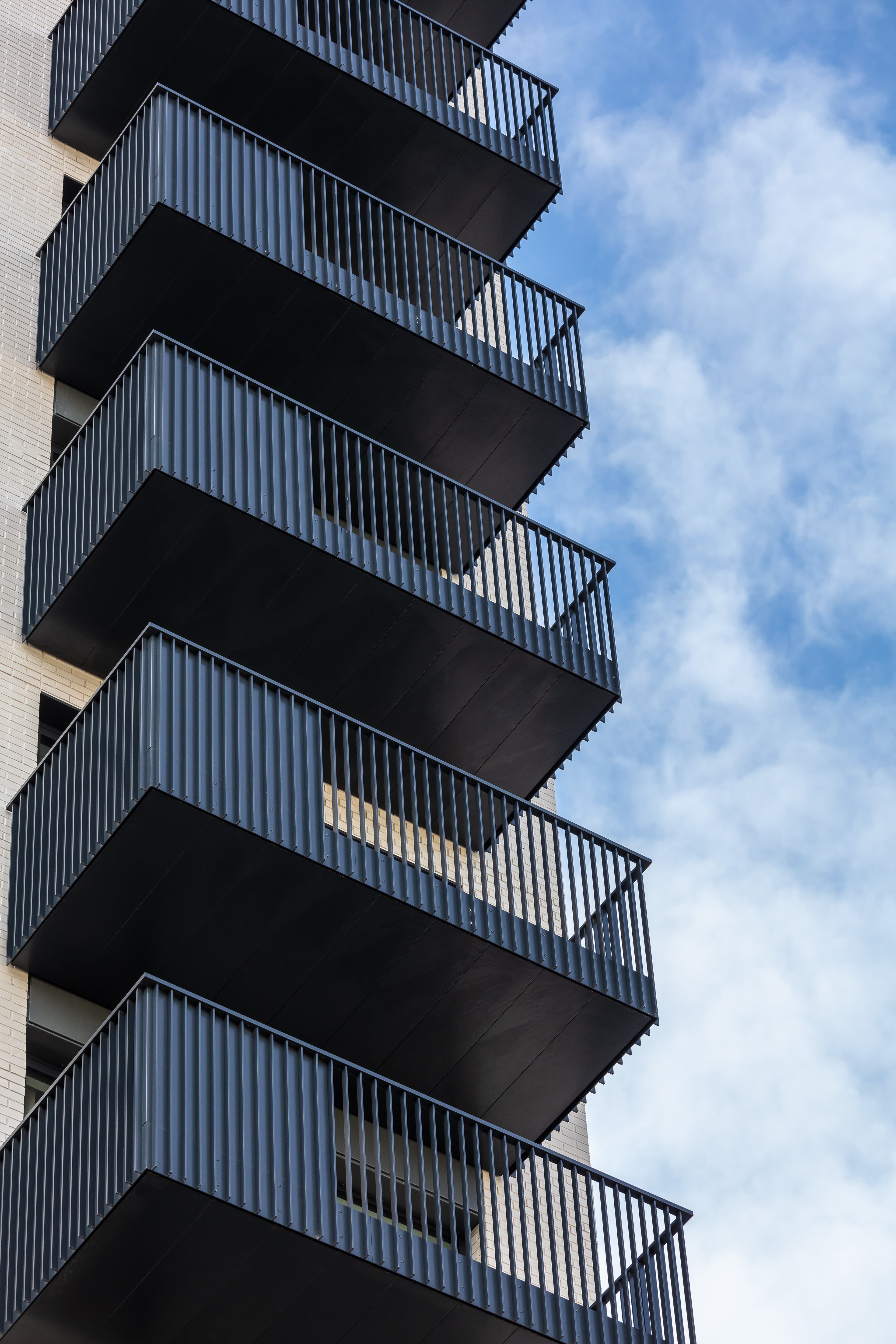 To resolve the challenge of an island site, parking and a principal entrance plaza are located at grade, while new pedestrian routes and landscaped gardens at first floor level link the various blocks and offer a sense of place to residents. The entrance plaza is formed by office and amenity spaces, screening the parking and fostering active use.