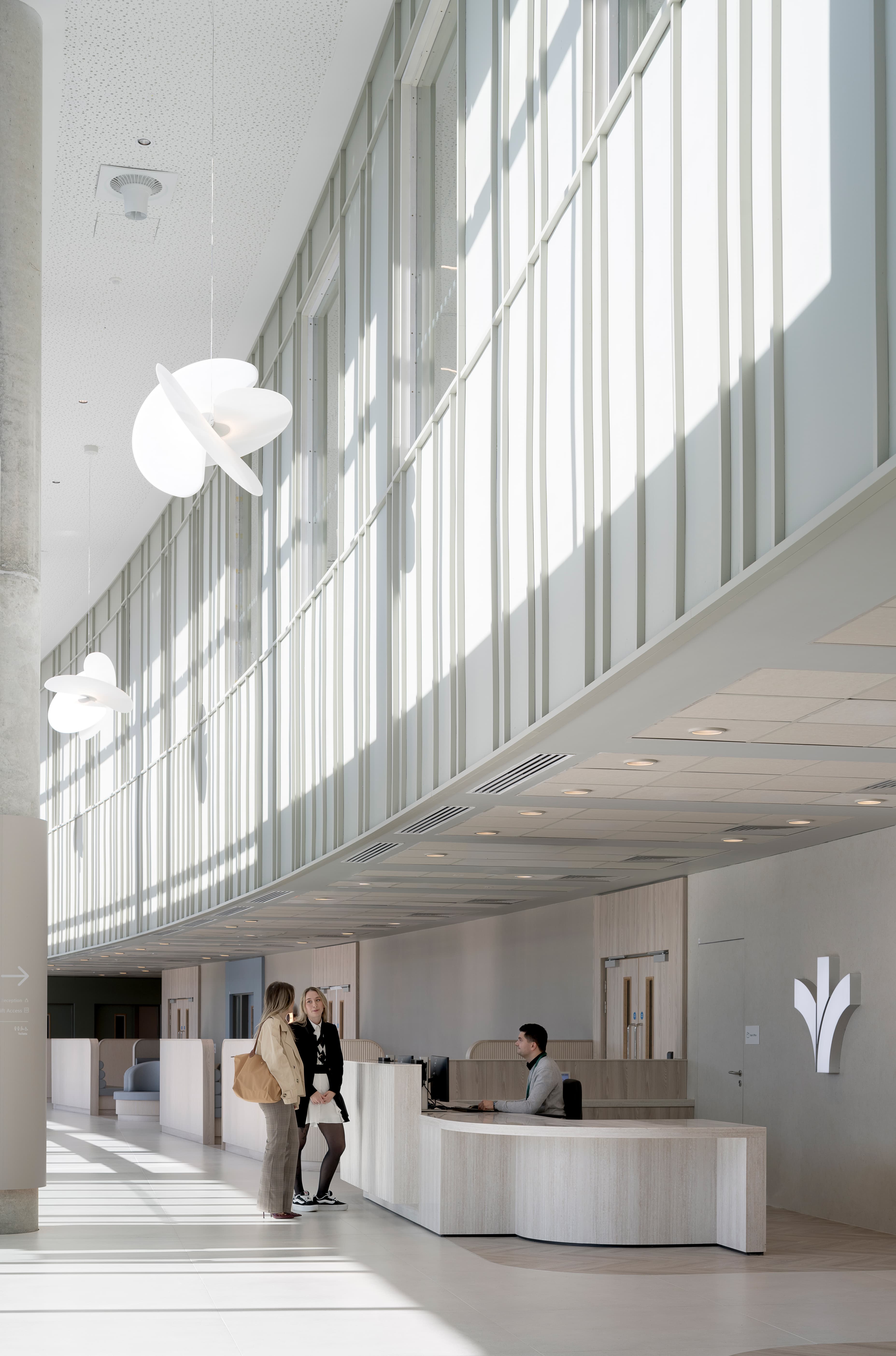Material selection balances durability, safety, and sustainability. Antimicrobial surfaces, renewable timbers, and recycled materials create a robust yet non-institutional environment. Wayfinding is integrated into the architectural language through floral motifs and therapeutic colour palettes, reducing reliance on signage and reinforcing a calm, intuitive user experience.