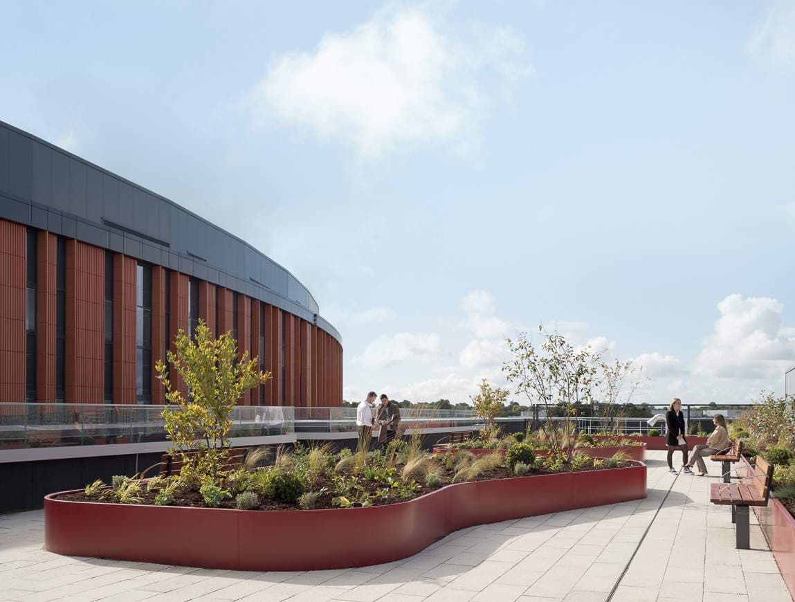 Biophilic design is embedded throughout the hospital. Natural light, access to greenery, and the use of organic materials contribute to a restorative atmosphere within a high-acuity clinical setting. Internally, a light-filled concourse anchors the public realm, offering clarity of movement and moments of pause. Upper-level inpatient accommodation comprises single rooms with panoramic views and access to rooftop gardens, supporting privacy, dignity, and recovery through direct engagement with nature.