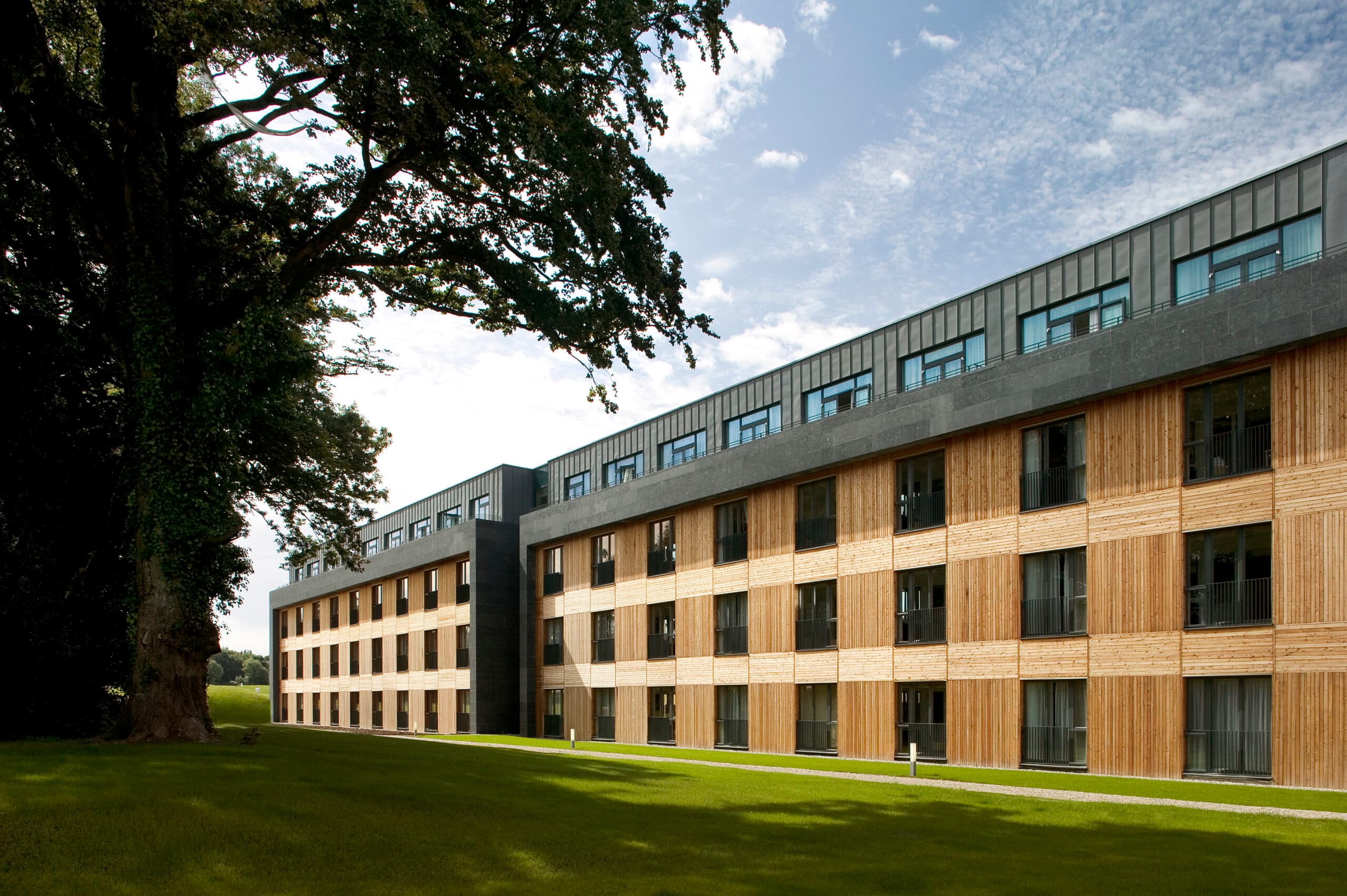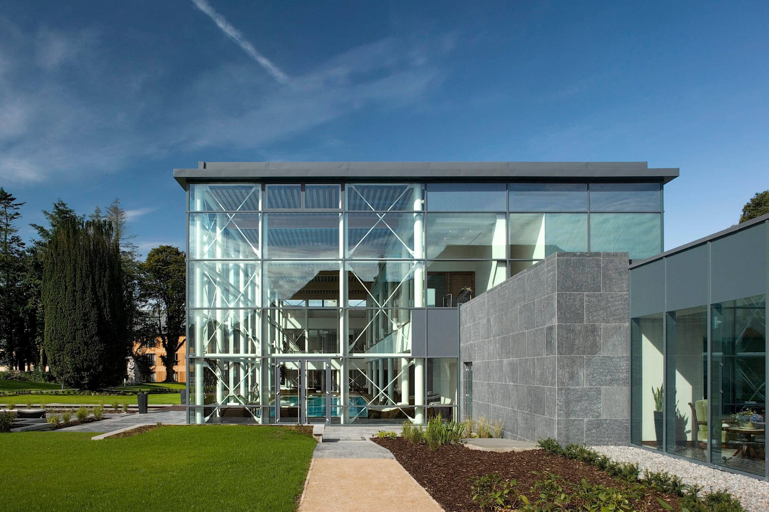 New elements introduced to the resort arrangement were conceived with retrained materiality to reduce visual impact. Sited with deference to the existing manor house, they were developed as a contemporary extension to the west of the existing house, laid out to avail of partial screening offered by existing mature woodland connected to the original house by a glazed highly transparent modern intervention.