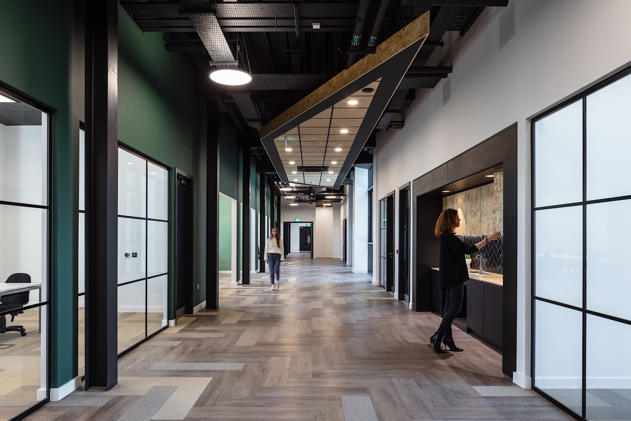 Drawing inspiration from the site's heritage, Reddy A+U crafted a vibrant design that blends modern steel and glass facades with the industrial context. Salvaged steel from the existing roof structure was repurposed for the reception desk and hot desk areas. The design intentionally exposed new structural elements, such as the spliced column sections on the upper floor. These exposed steel columns are echoed in the fourth-floor corridor, creating a rhythmic pattern that serves as a backdrop for communal breakout and coffee points.