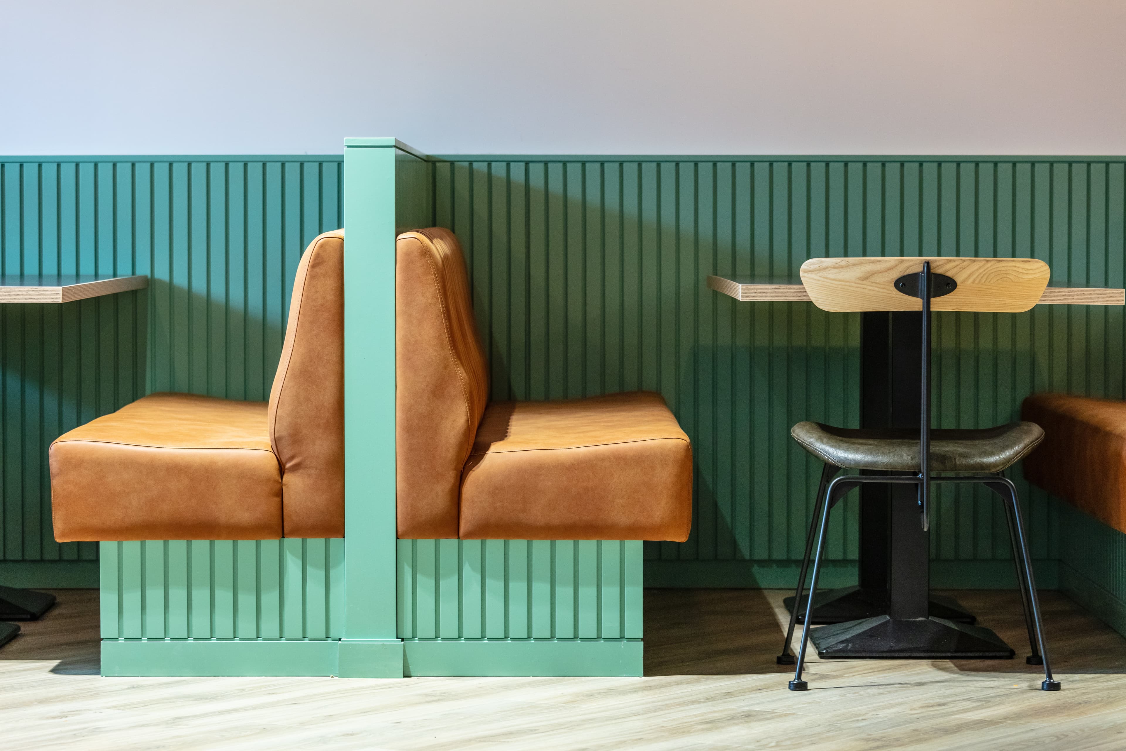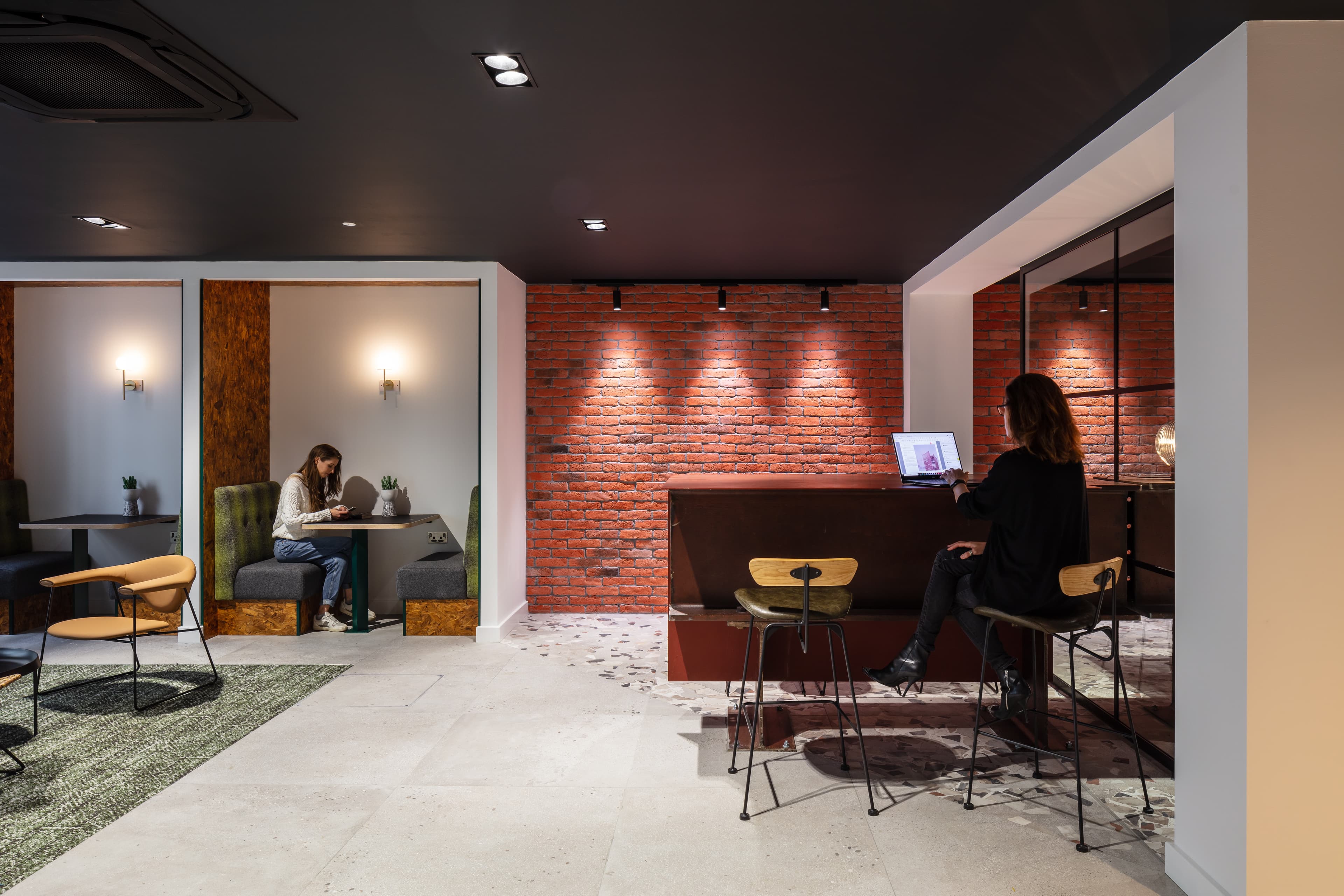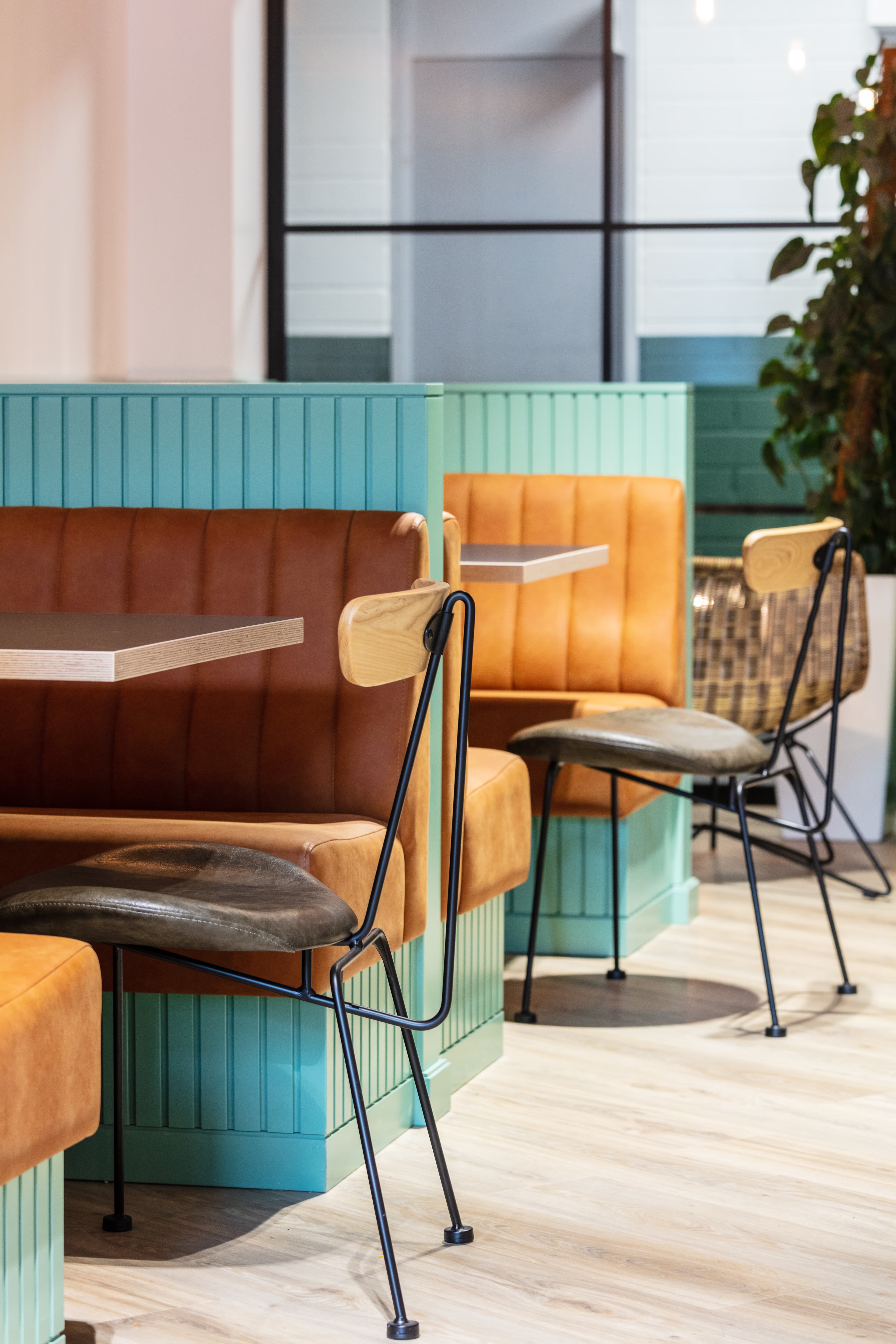 With a 40% expansion requested for the Ground Floor Café to accommodate increased occupancy, the existing structural piles dictated which walls could be retained. Reddy A+U leveraged this constraint to design a framework for the main servery and create seating niches that also function as semi-private meeting booths.