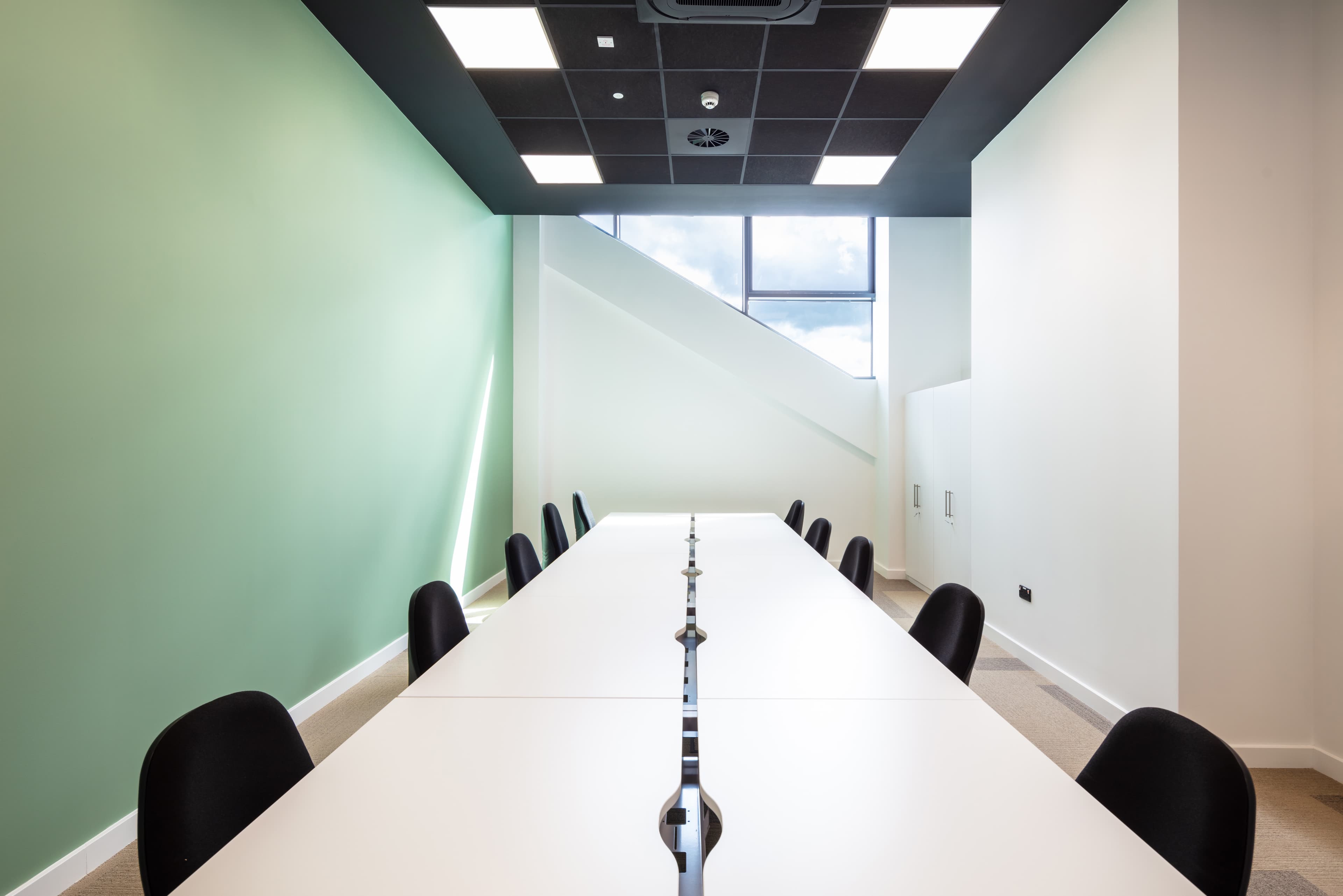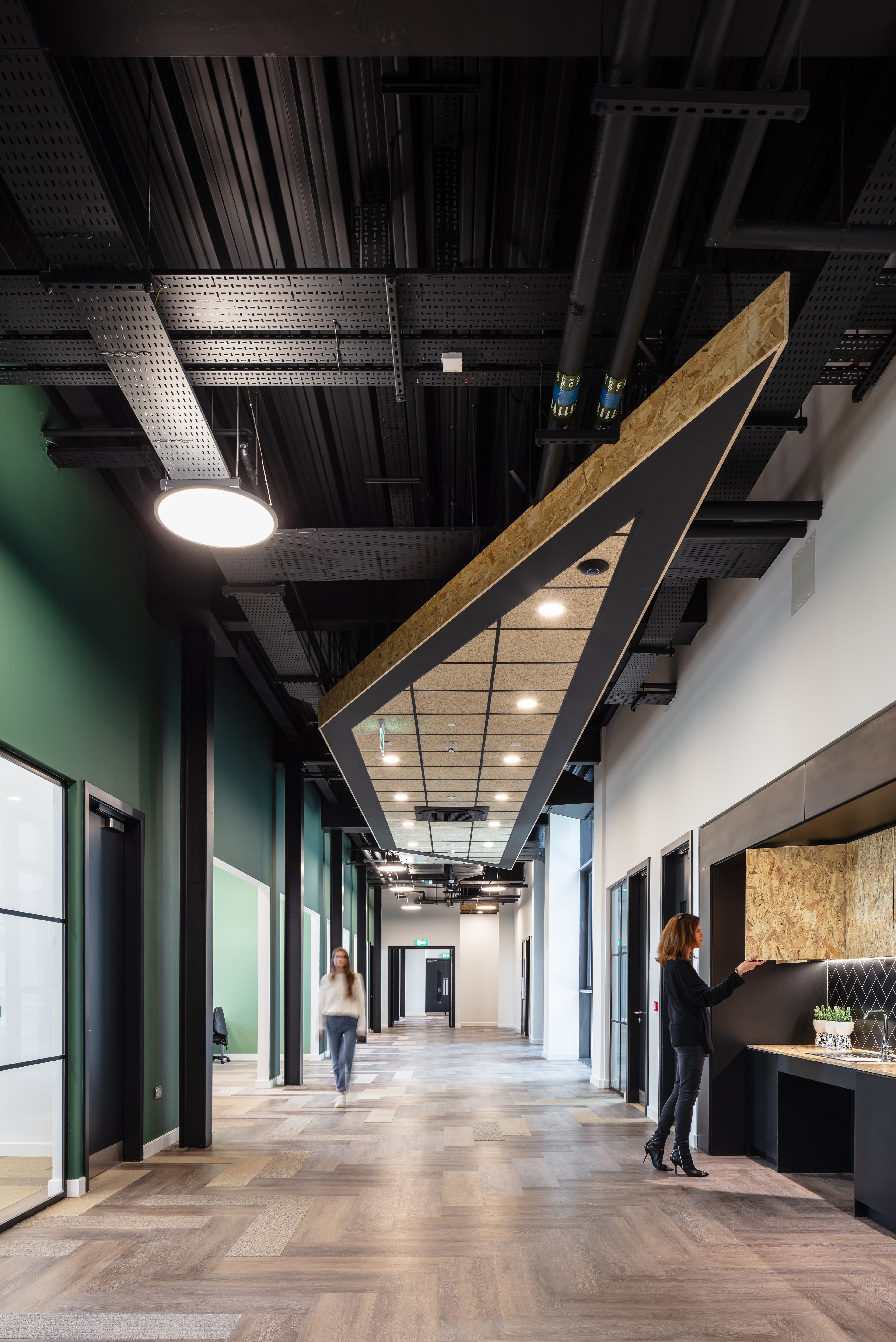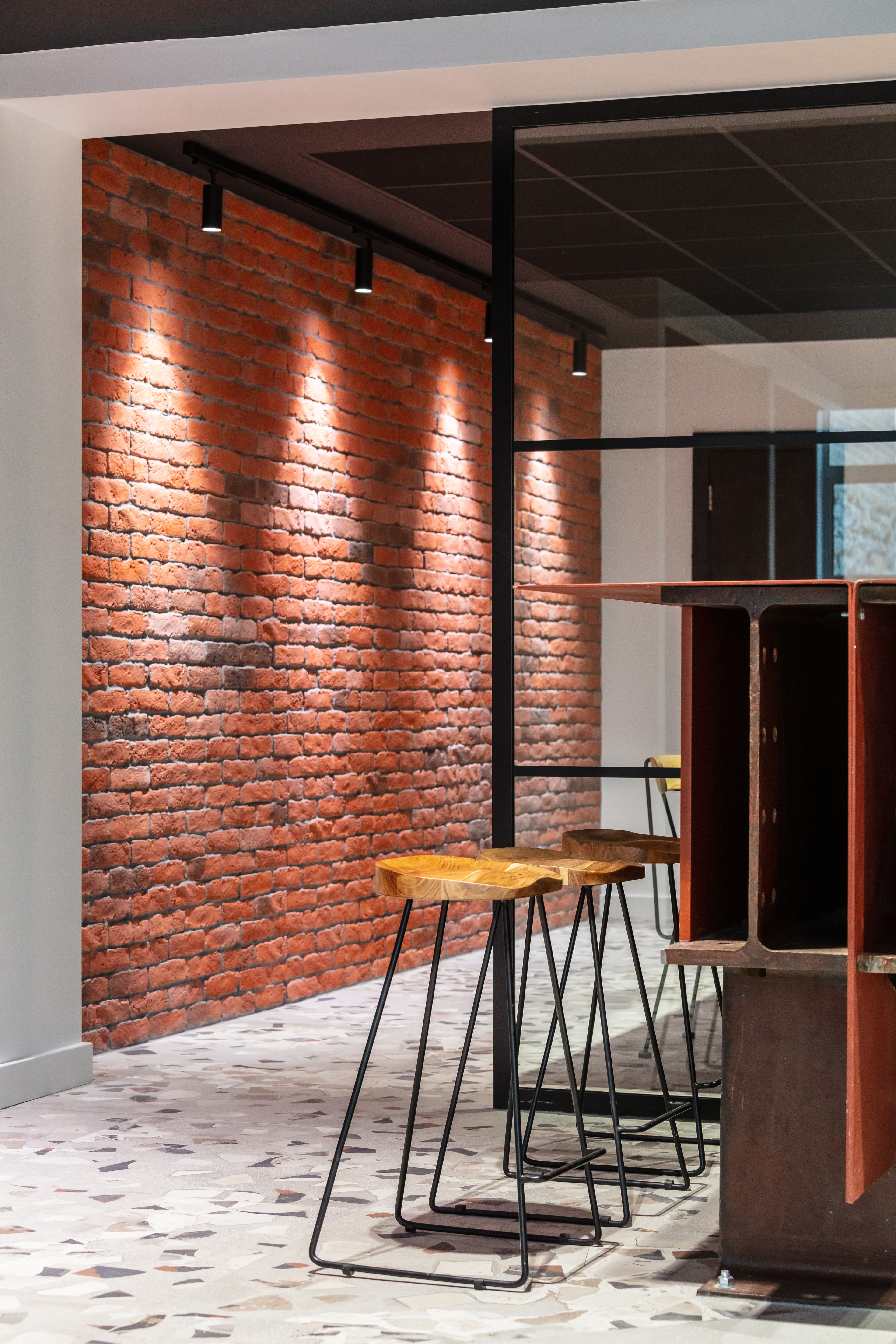Inspired by the site's heritage, Reddy A+U blended modern steel and glass with the industrial context. Salvaged steel from the existing roof was repurposed for the reception and hot desk areas. Exposed structural elements, like spliced columns on the upper floor, are mirrored in the fourth-floor corridor, creating a rhythmic backdrop for communal spaces.