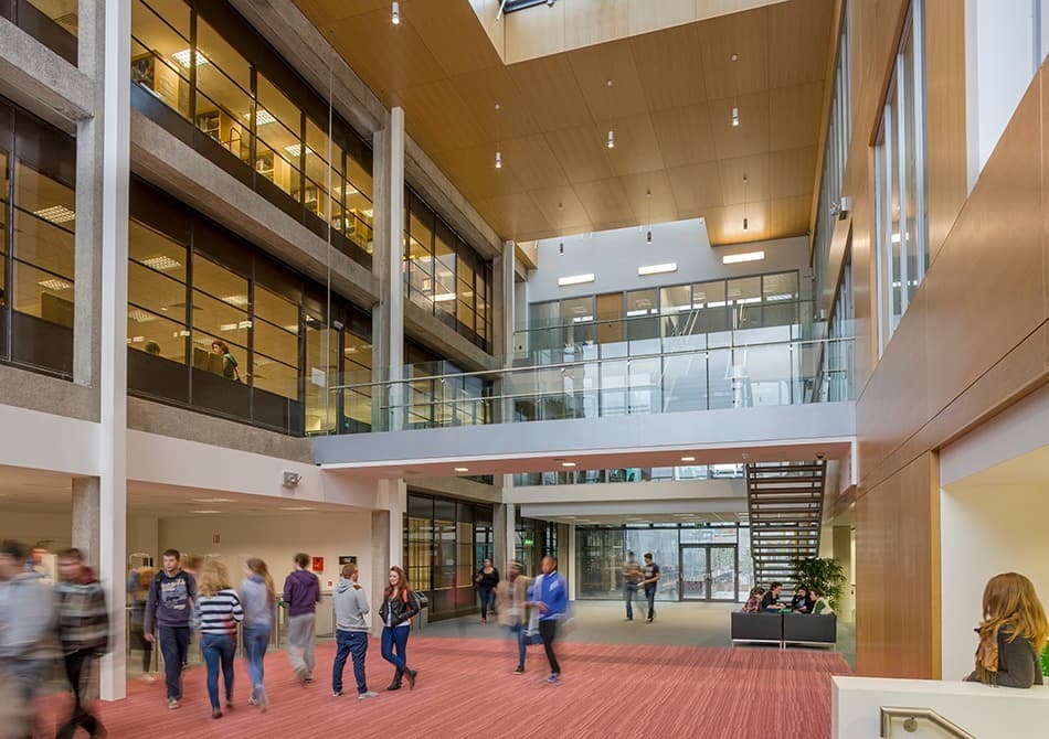 The extension is conceived with the pedestrian access routes and desire lines from the southern campus areas defining the building edge. The massing of the structure and its cantilevered form facilitates a dramatic new main entrance atrium link to the existing undergraduate and new post graduate facility as an interconnector of the existing Library and the new angular extension.