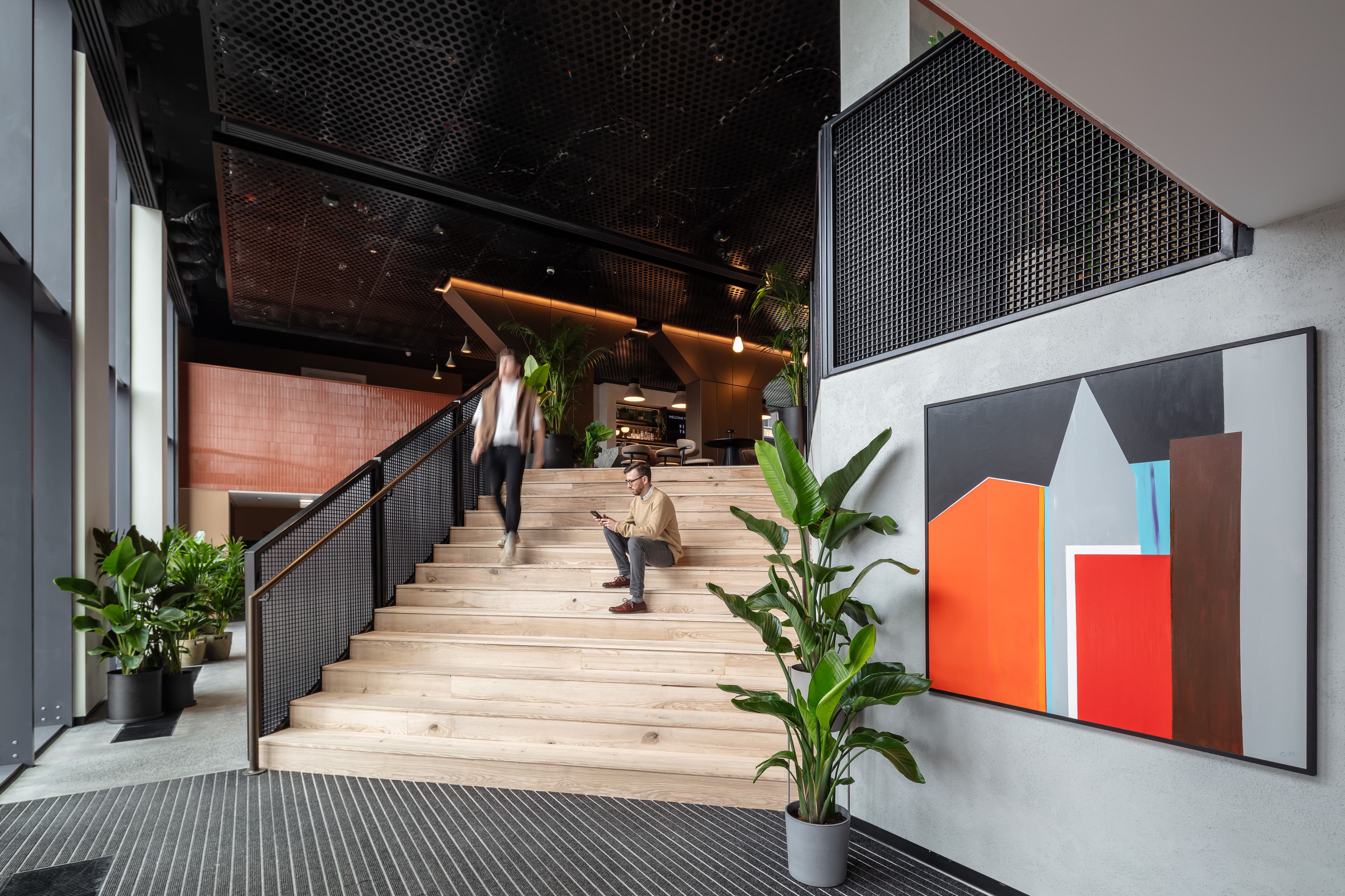 The design balances an urban aesthetic with durability and warmth. Robust materials like concrete floors, high-pressure laminates, stone, and tiles were paired with biophilic elements such as textured fabrics, canopy-inspired motifs, and abundant planting, resulting in a future-proof, humancentric environment with a certification of BREAAM Excellent.