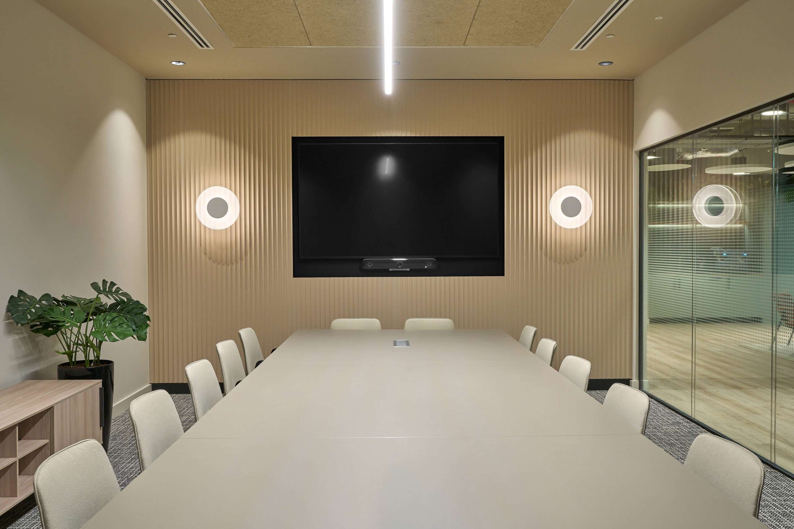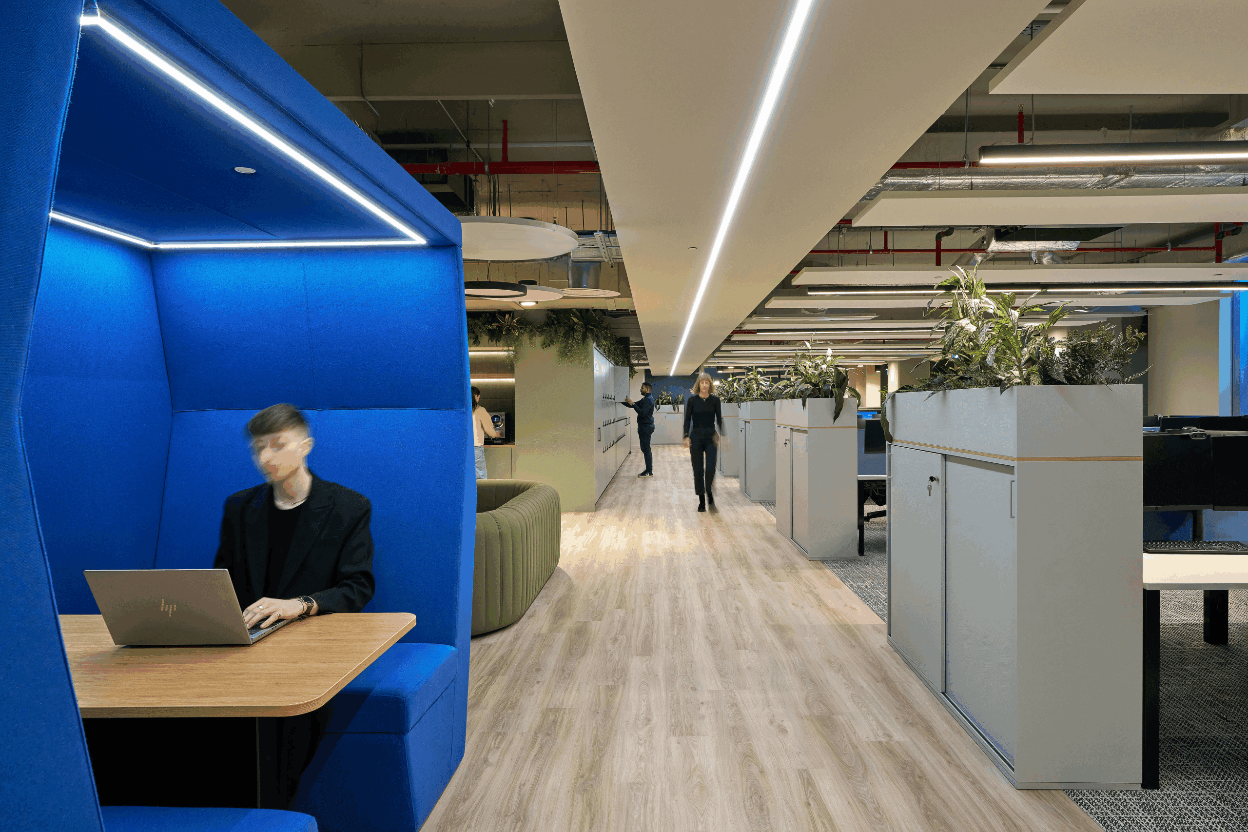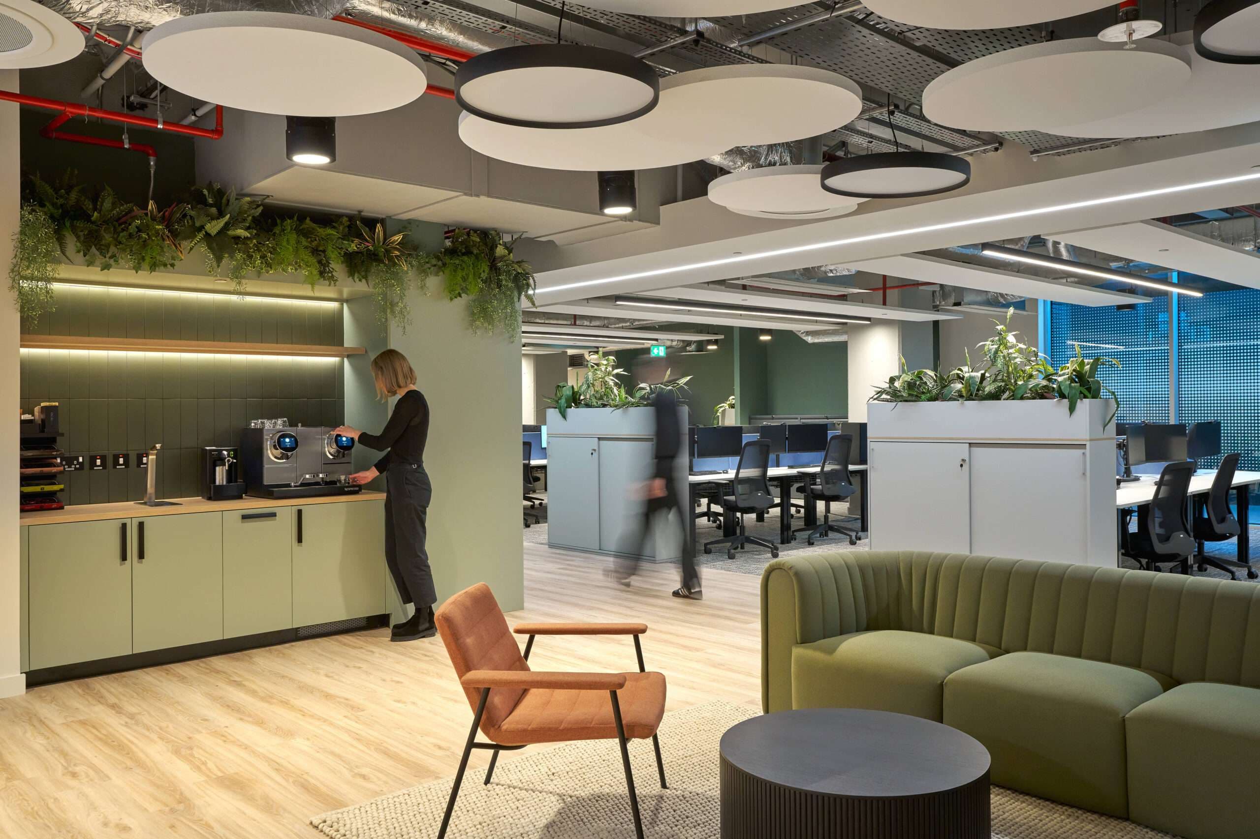 Key to this transformation was the incorporation of biophilic design principles, enhancing wellbeing through natural elements such as integrated planting, warm natural finishes, and improved acoustics. A calm and welcoming atmosphere was achieved using a natural colour palette aligned with brand guidelines, creating a cohesive and professional environment. The completed office successfully balances functionality, aesthetics, and brand alignment.