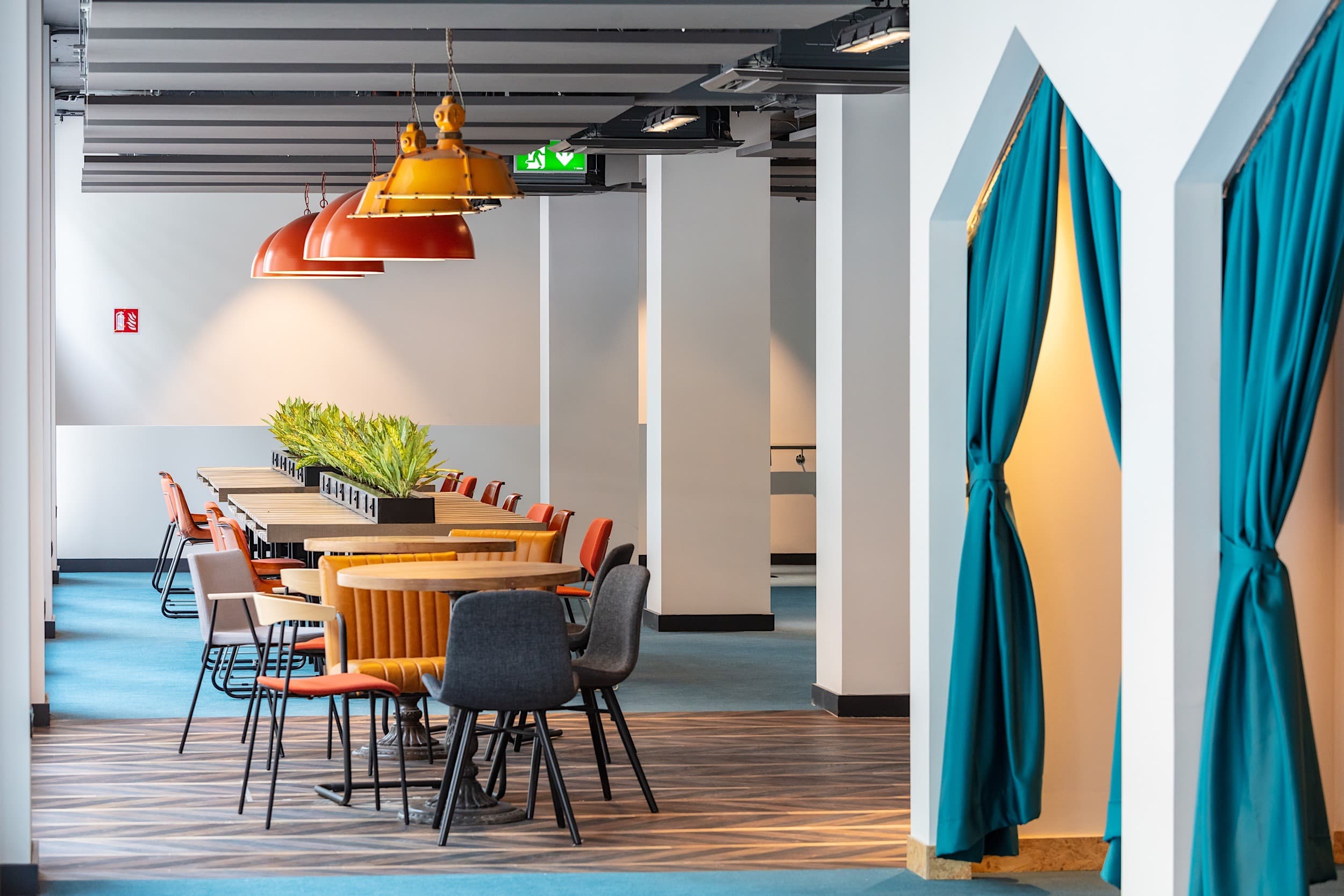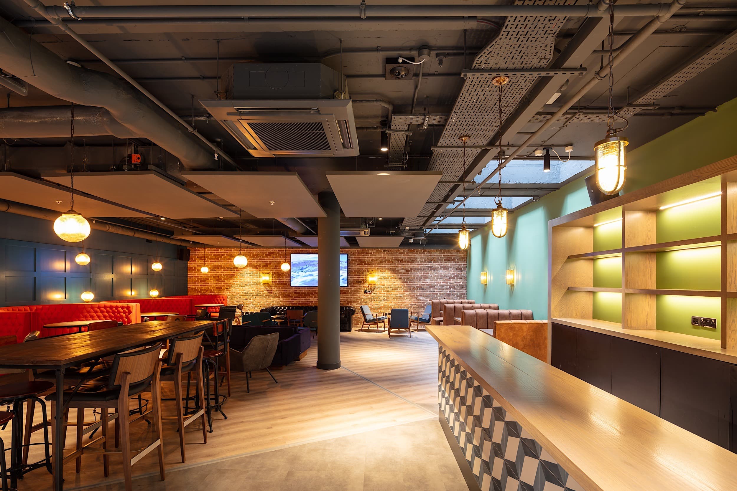 Both buildings feature main hubs in their reception areas, equipped with gaming zones, TVs, gaming pods, a feature food truck, group seating, and small breakout spaces. The open-plan layout is versatile, accommodating events and daily activities. Connected to these hubs are ’Seating Huts’, offering quieter, private spaces for individuals or small groups.