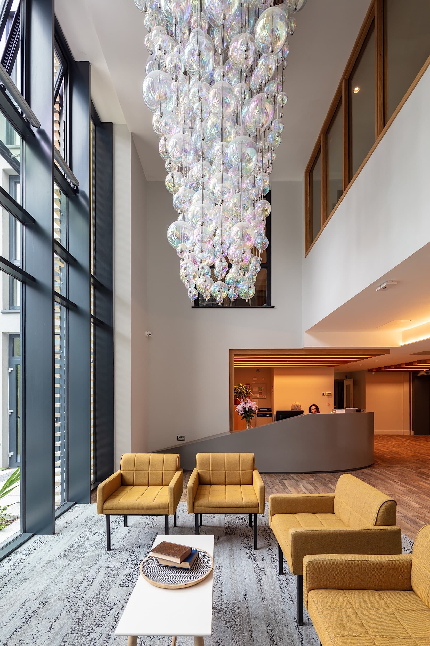 Particular attention was given to fabric and wallpaper choices. Bespoke day-room chairs were upholstered in antimicrobial, hygienic fabrics that were tactile and non-clinical, ensuring they were easy to grip for less mobile occupants.