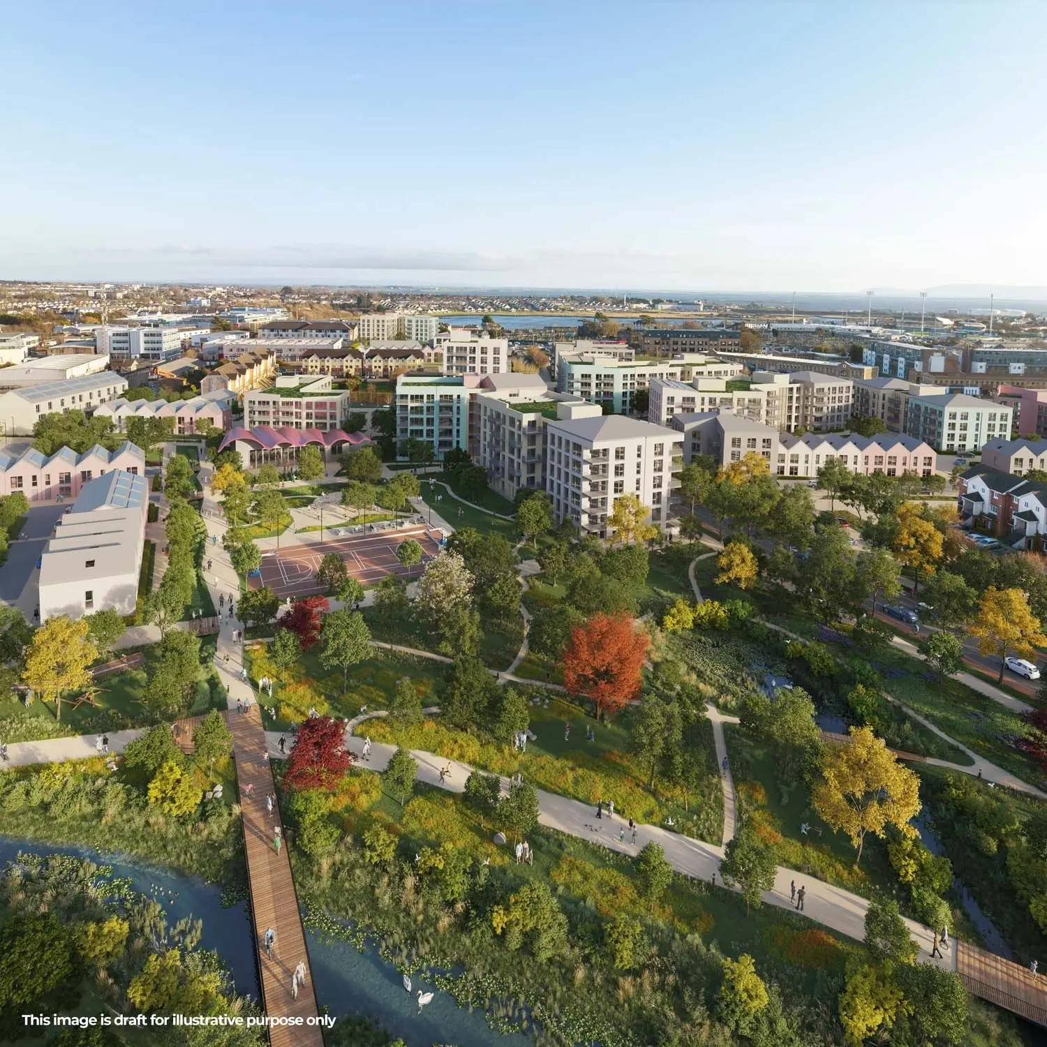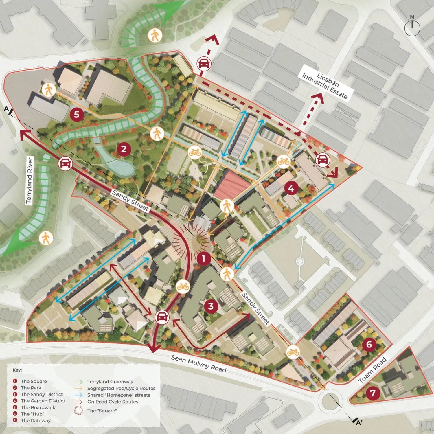 A once in a generation opportunity to transform an underutilised, brownfield area into a new sustainable and biodiverse urban quarter. 'Ceantar na nGainimh' - meaning the Sandy Quarter - will be easy to access and navigate via new pedestrian and cycle routes. These routes will create a walkable neighbourhood, sparking growth and regeneration across the wider area including the adjacent Liosbán Estate.