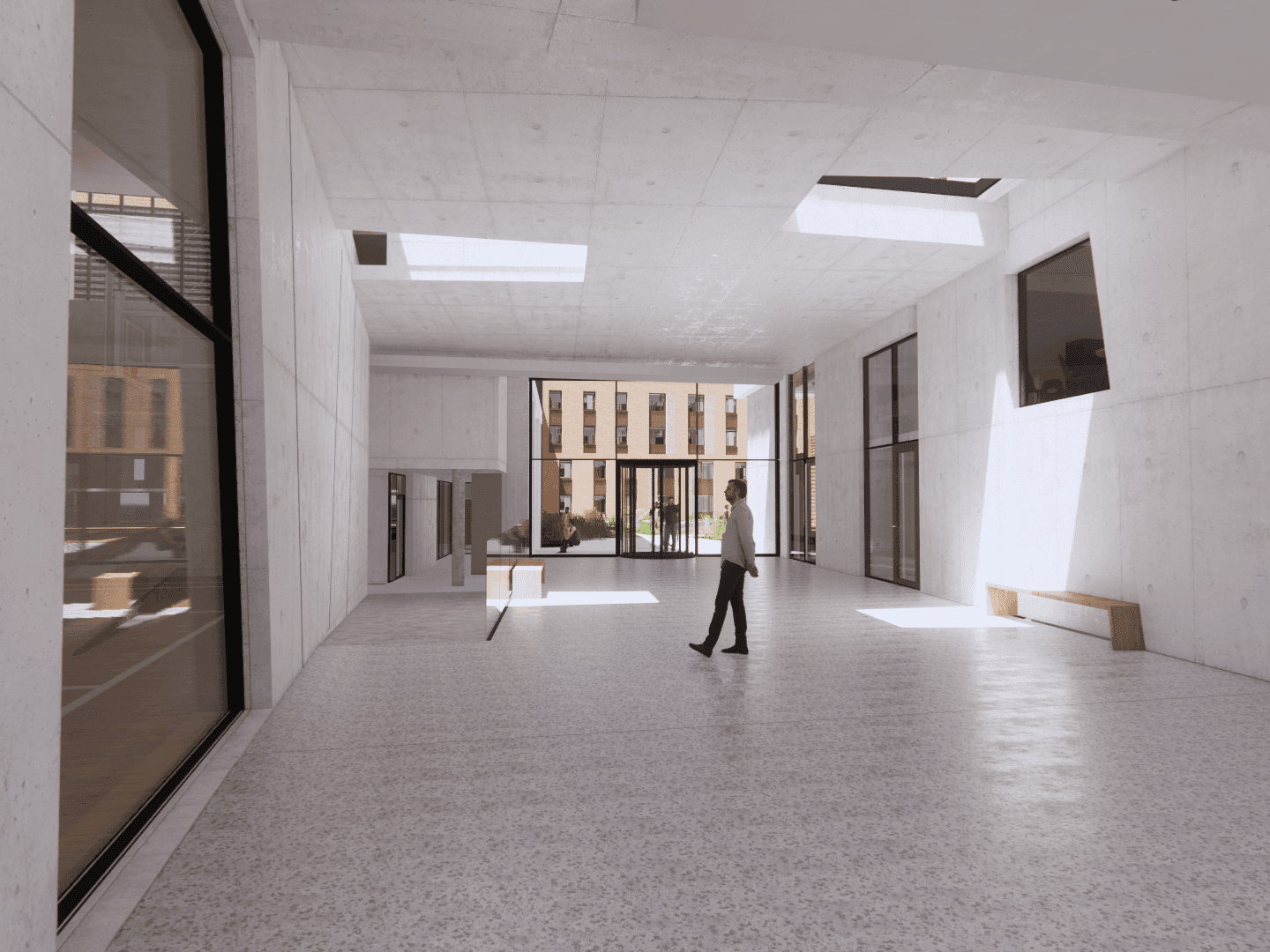 The forum space creates a new east-west axis through the site, linking the proposed residential courtyard with the existing plaza and pedestrian gate to the west. Outdoor amenity spaces are provided within the central courtyard together with enhanced public realm works, landscaping, bicycle parking and a single storey security hut.
