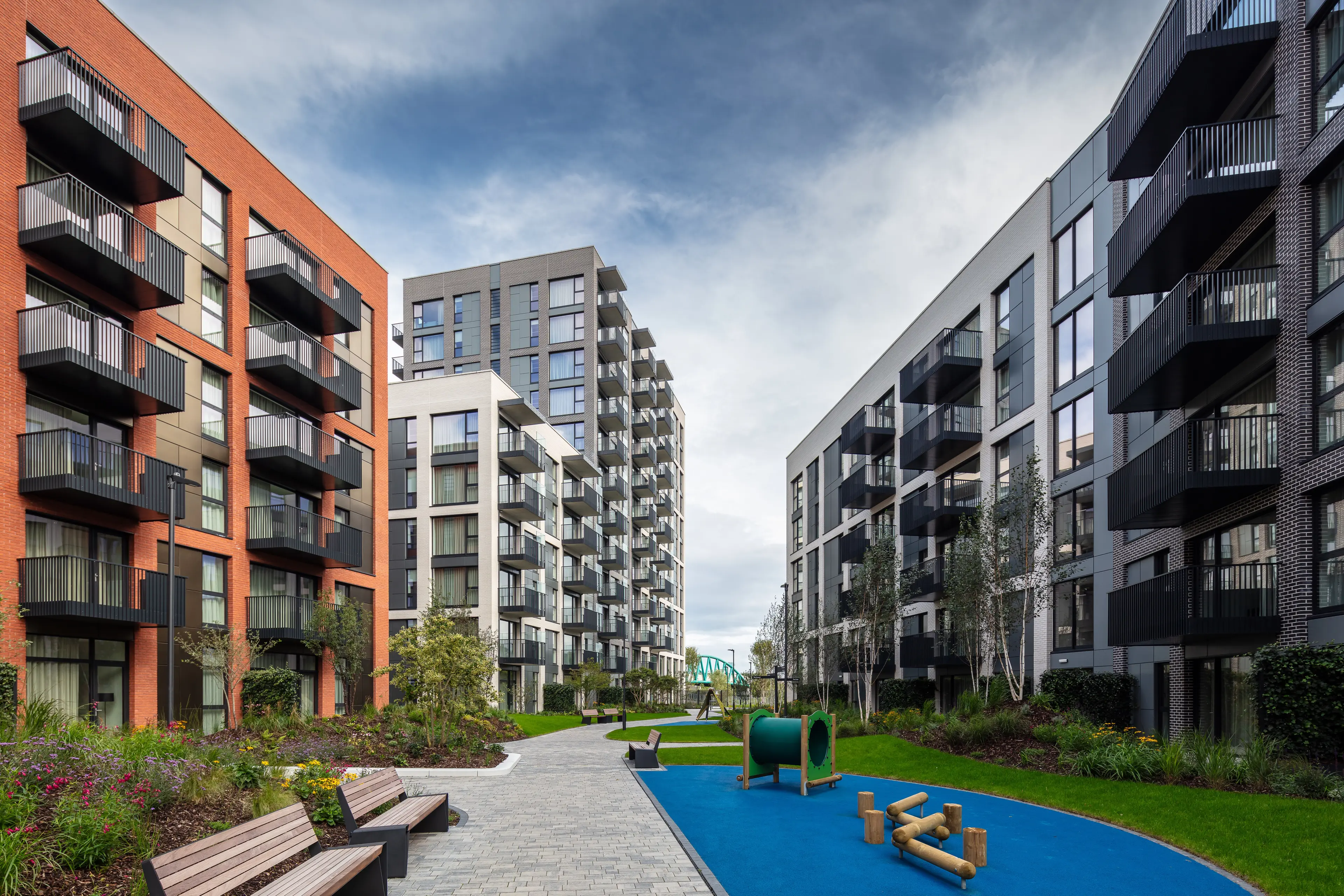 To resolve the challenge of an island site, parking and a principal entrance plaza are located at grade, while new pedestrian routes and landscaped gardens at first floor level link the various blocks and offer a sense of place to residents. The entrance plaza is formed by office and amenity spaces, screening the parking and fostering active use.