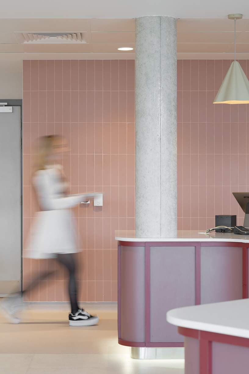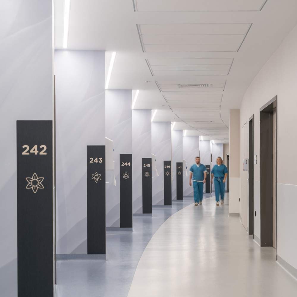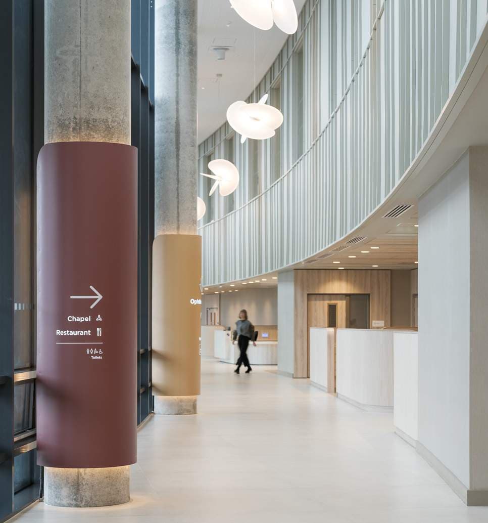 Material selection balances durability, safety, and sustainability. Antimicrobial surfaces, renewable timbers, and recycled materials create a robust yet non-institutional environment. Wayfinding is integrated into the architectural language through floral motifs and therapeutic colour palettes, reducing reliance on signage and reinforcing a calm, intuitive user experience.