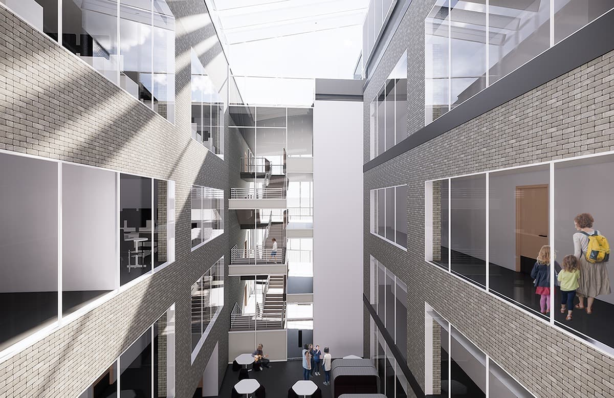 Extensive glazing in the entrance area and central atrium bring daylight deep into the building while these elements also help with orientation, and wayfinding, as users move through the building.