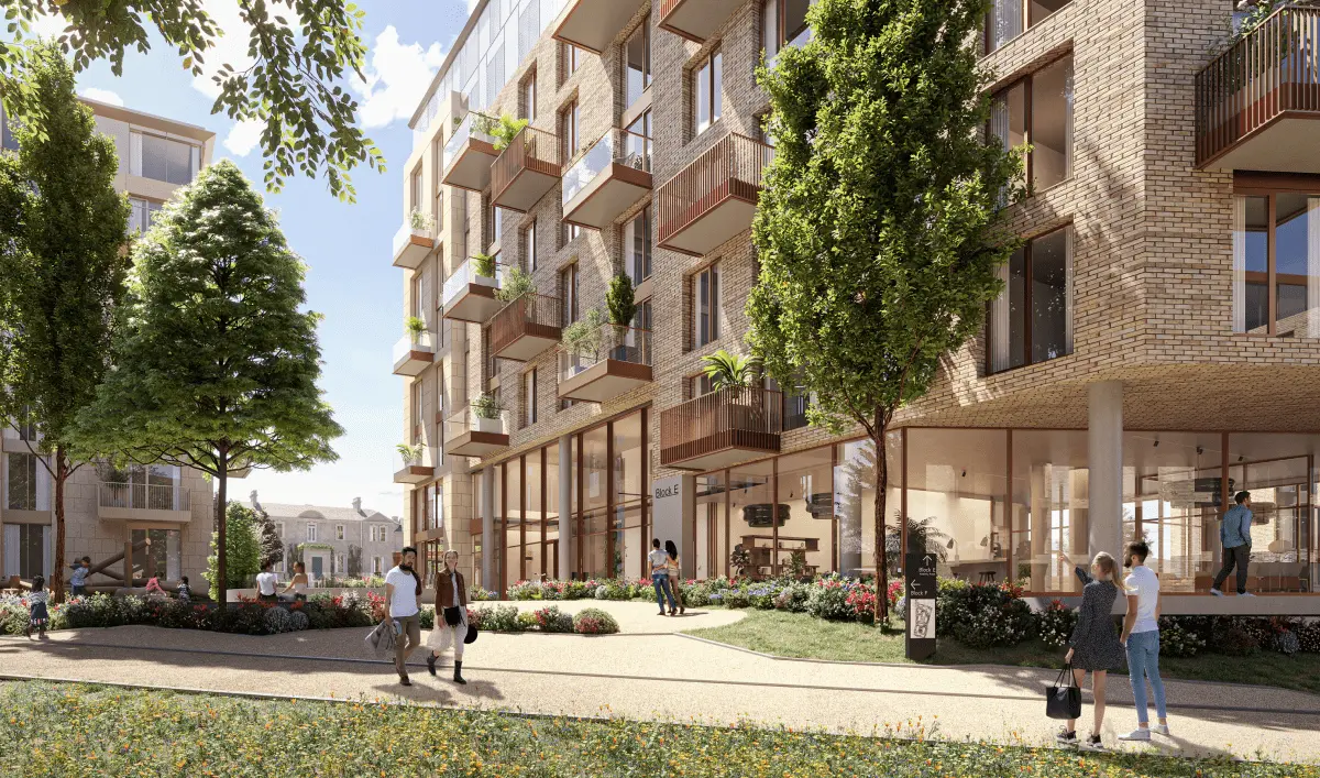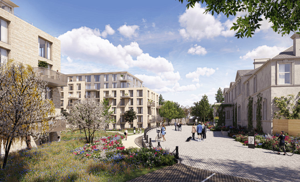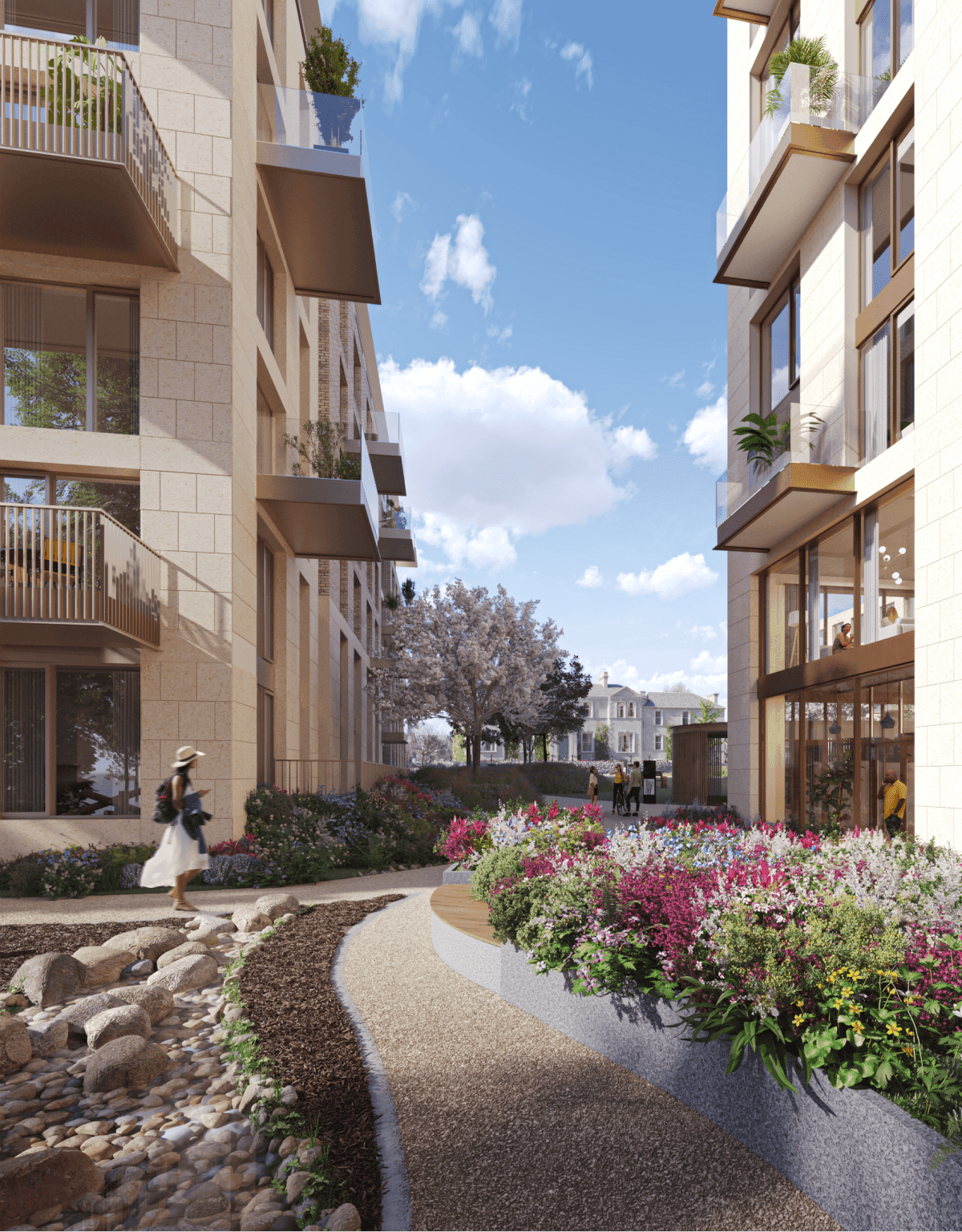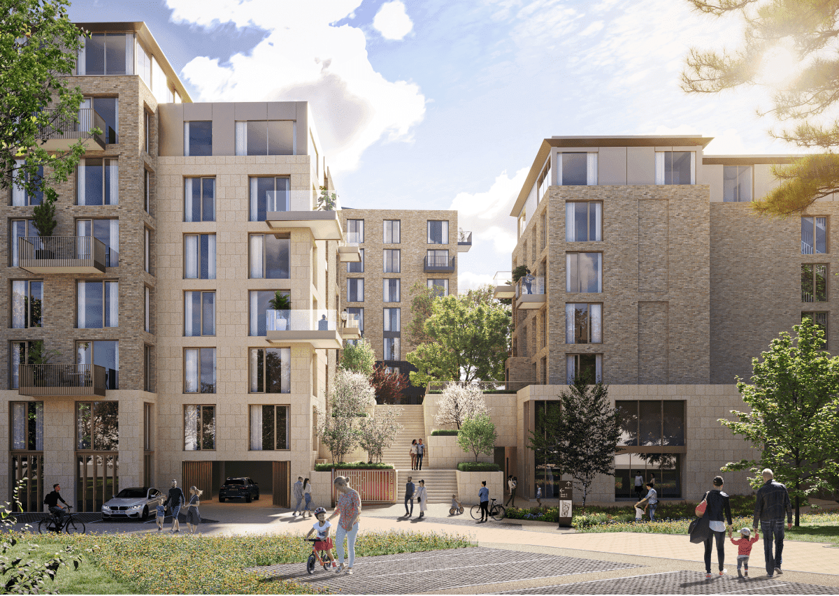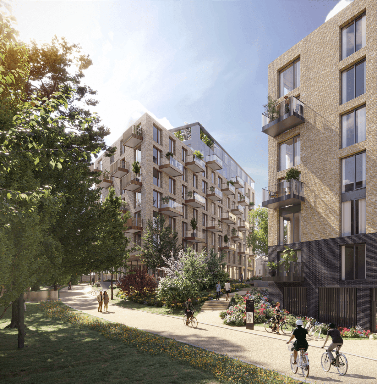 Shared by pedestrians, cyclists and limited vehicles, the main historic avenue on the site is to be maintained and used as a central spine which connects the blocks to smaller pedestrian linkages from the main route, creating permeability across the scheme. The public space requirement is 15% of the overall site area, amounting to 5,370 sqm.