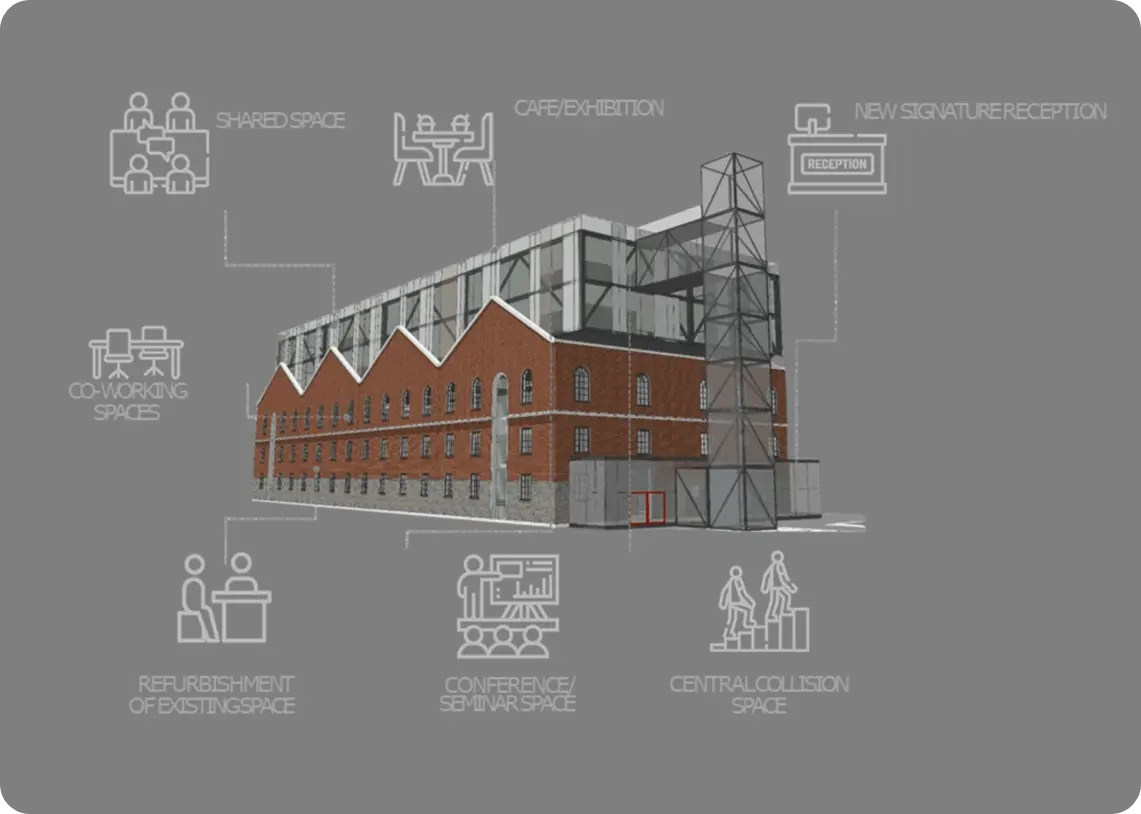The Guinness Enterprise Centre secured €10 million in additional funding to expand its capacity from 65 start-ups with 400 staff to 160 companies with 750 staff. For Reddy A+U, reimagining the building was a pivotal project, drawing on our experience with innovation and enterprise hubs to help realise the GEC's vision of creating a world-class innovation hub in Dublin 8.