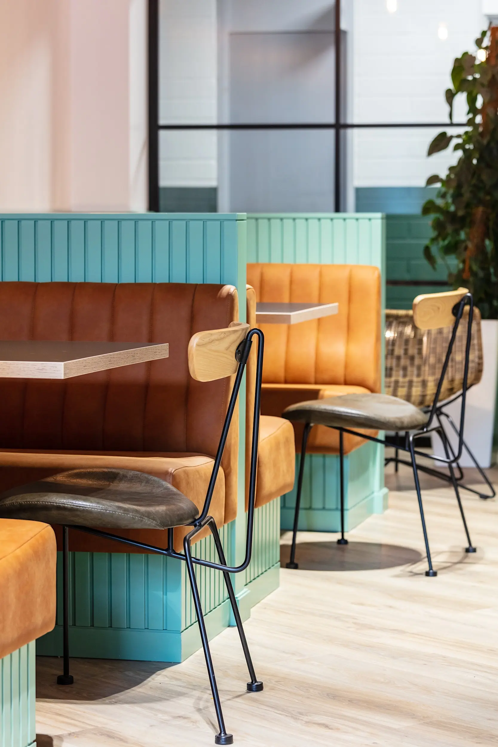 Drawing inspiration from the site's heritage, Reddy A+U crafted a vibrant design that blends modern steel and glass facades with the industrial context. Salvaged steel from the existing roof structure was repurposed for the reception desk and hot desk areas. The design intentionally exposed new structural elements, such as the spliced column sections on the upper floor. These exposed steel columns are echoed in the fourth-floor corridor, creating a rhythmic pattern that serves as a backdrop for communal breakout and coffee points.