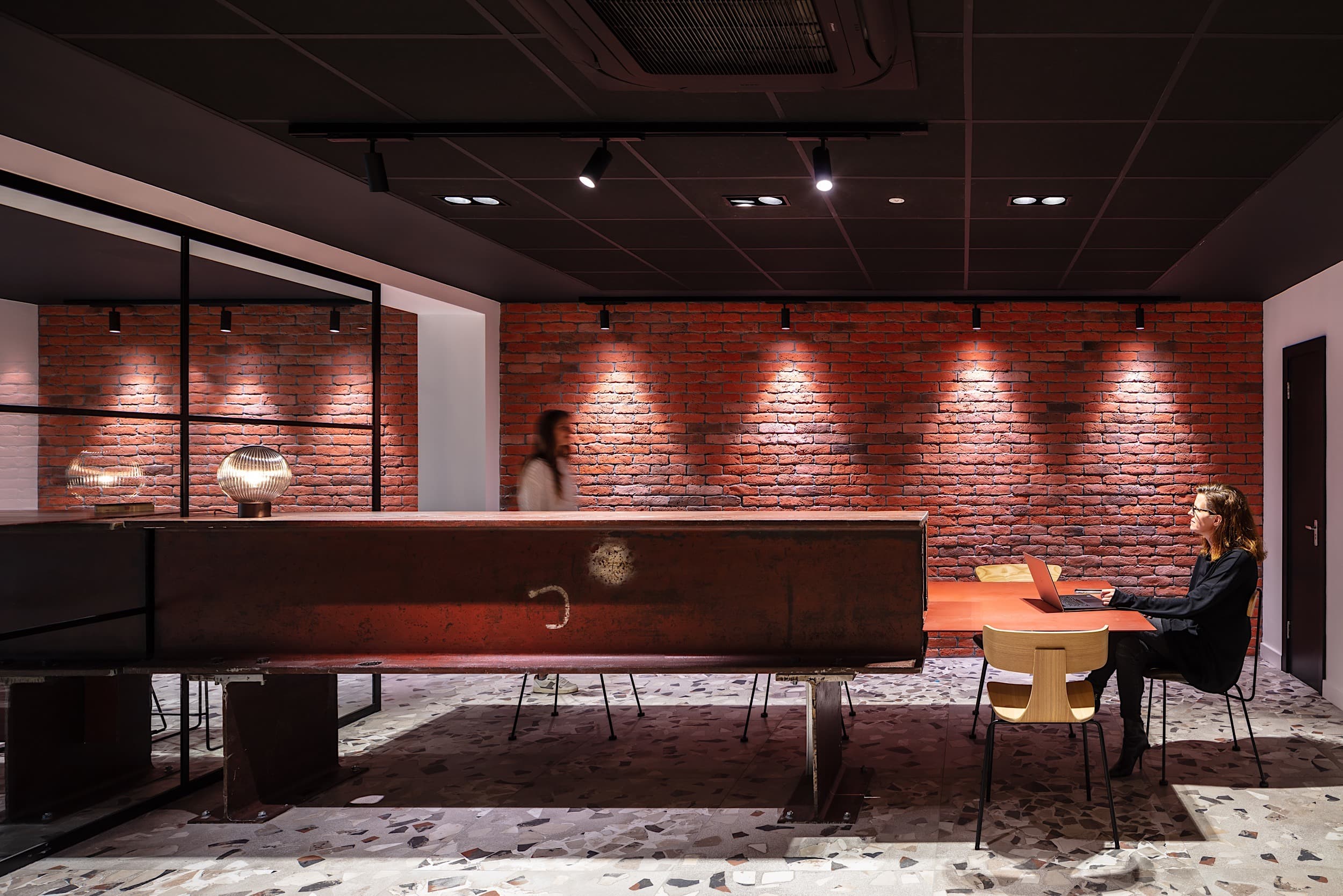 Inspired by the site's heritage, Reddy A+U blended modern steel and glass with the industrial context. Salvaged steel from the existing roof was repurposed for the reception and hot desk areas. Exposed structural elements, like spliced columns on the upper floor, are mirrored in the fourth-floor corridor, creating a rhythmic backdrop for communal spaces.