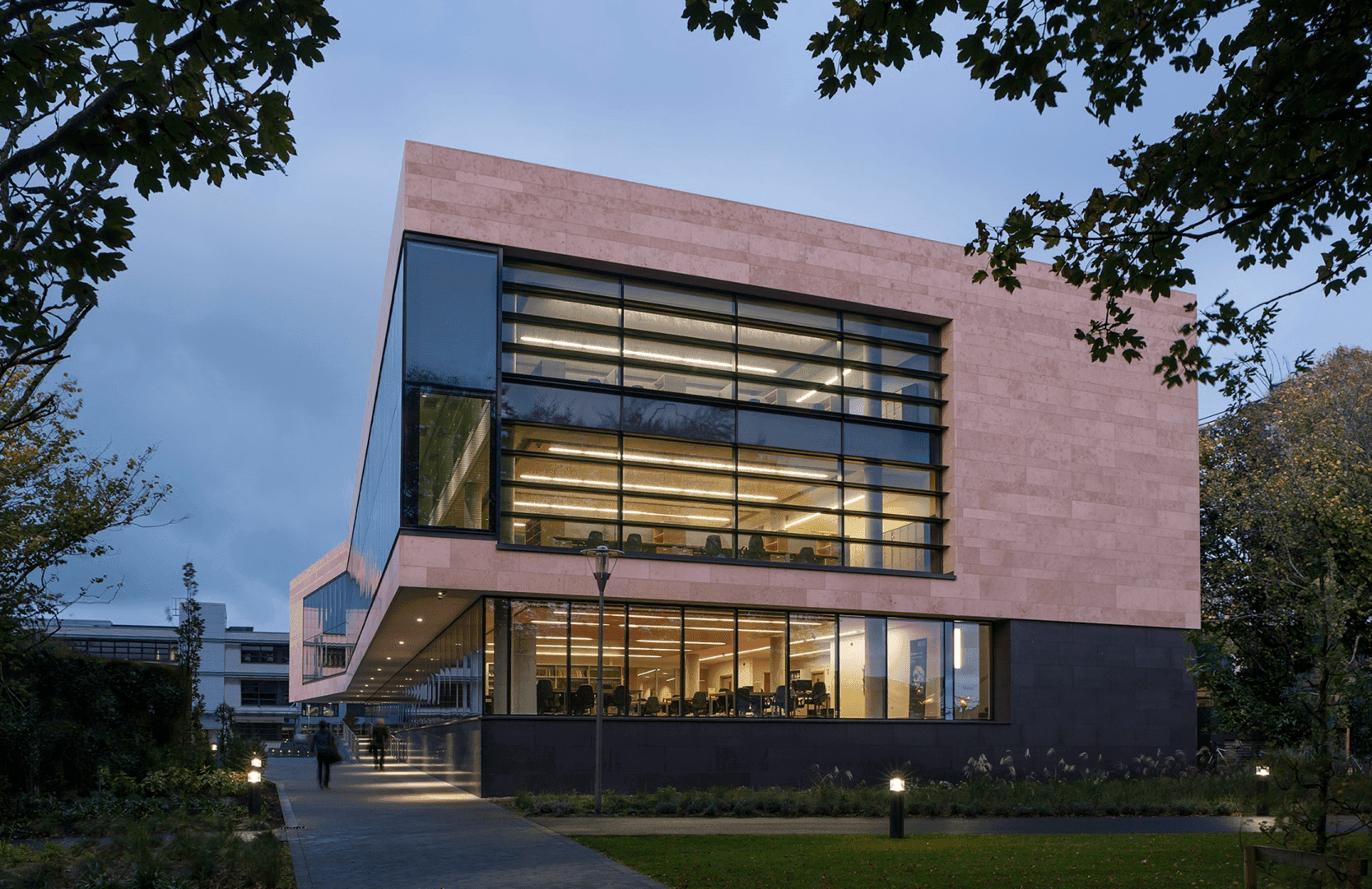 The extension is conceived with the pedestrian access routes and desire lines from the southern campus areas defining the building edge. The massing of the structure and its cantilevered form facilitates a dramatic new main entrance atrium link to the existing undergraduate and new post graduate facility as an interconnector of the existing Library and the new angular extension.