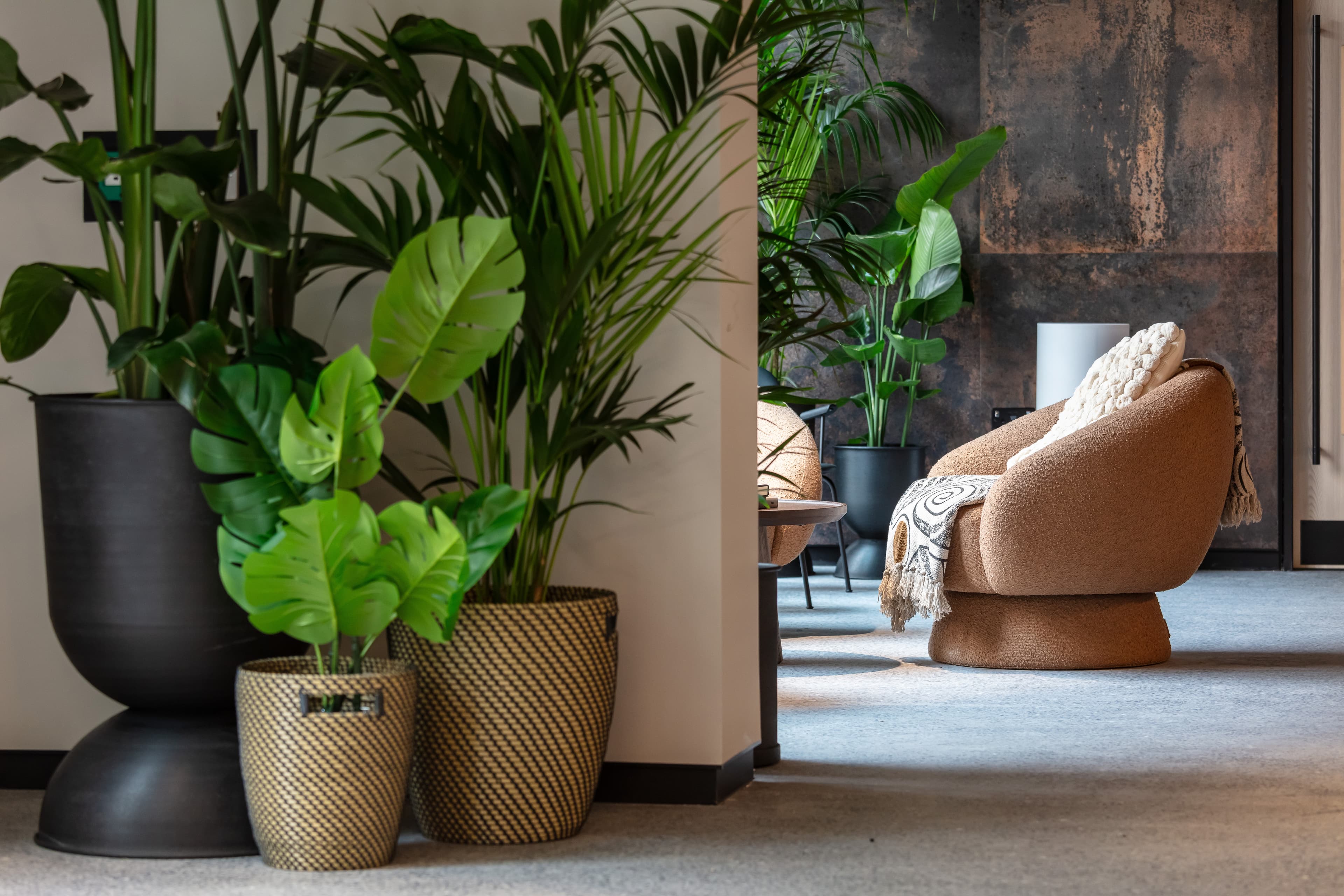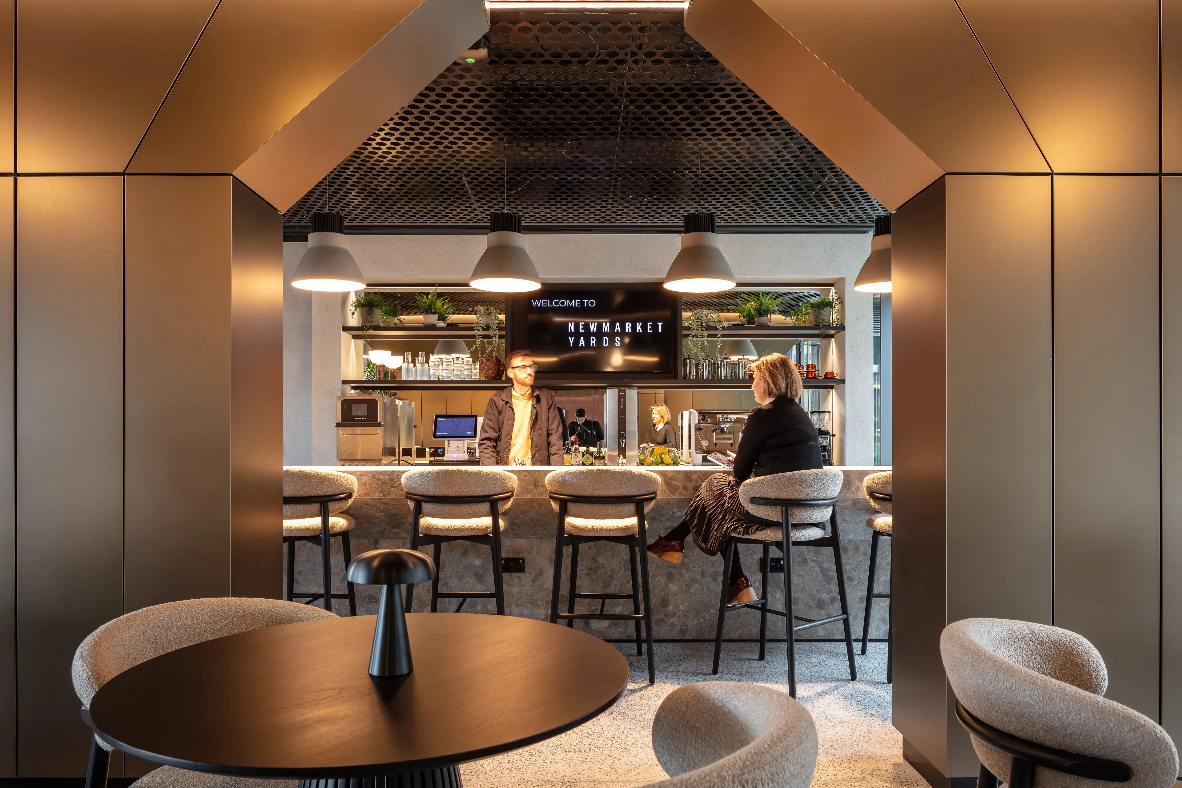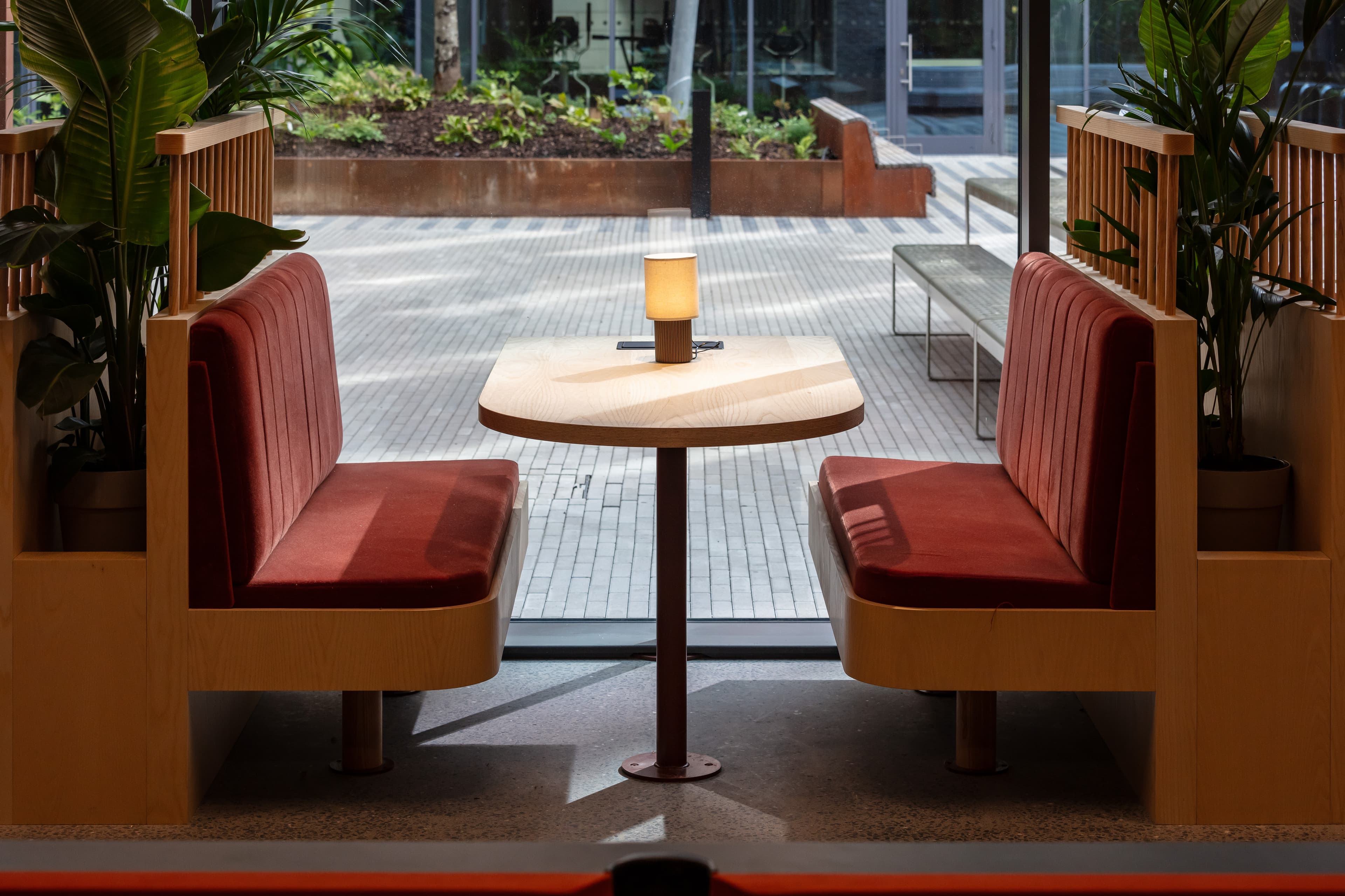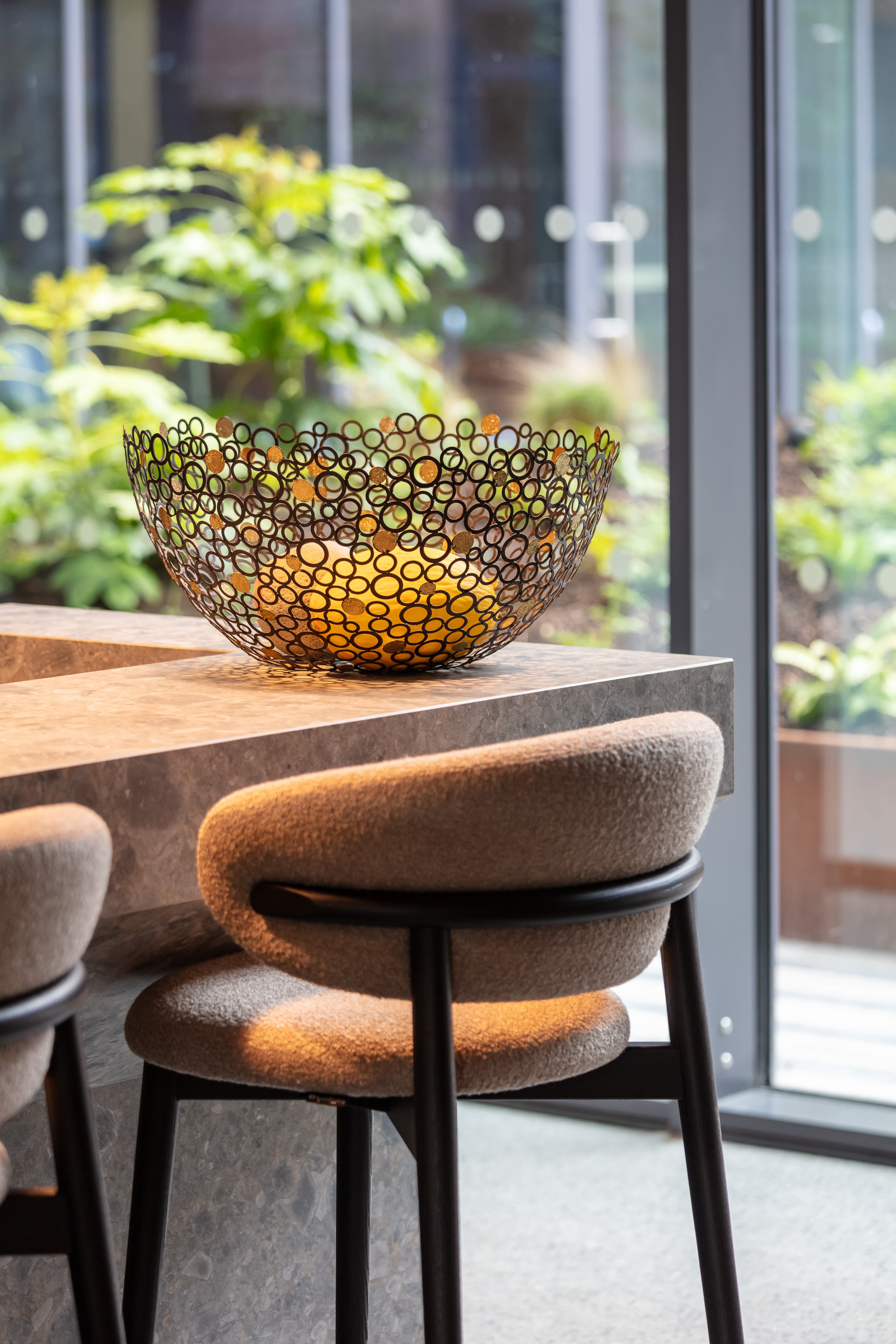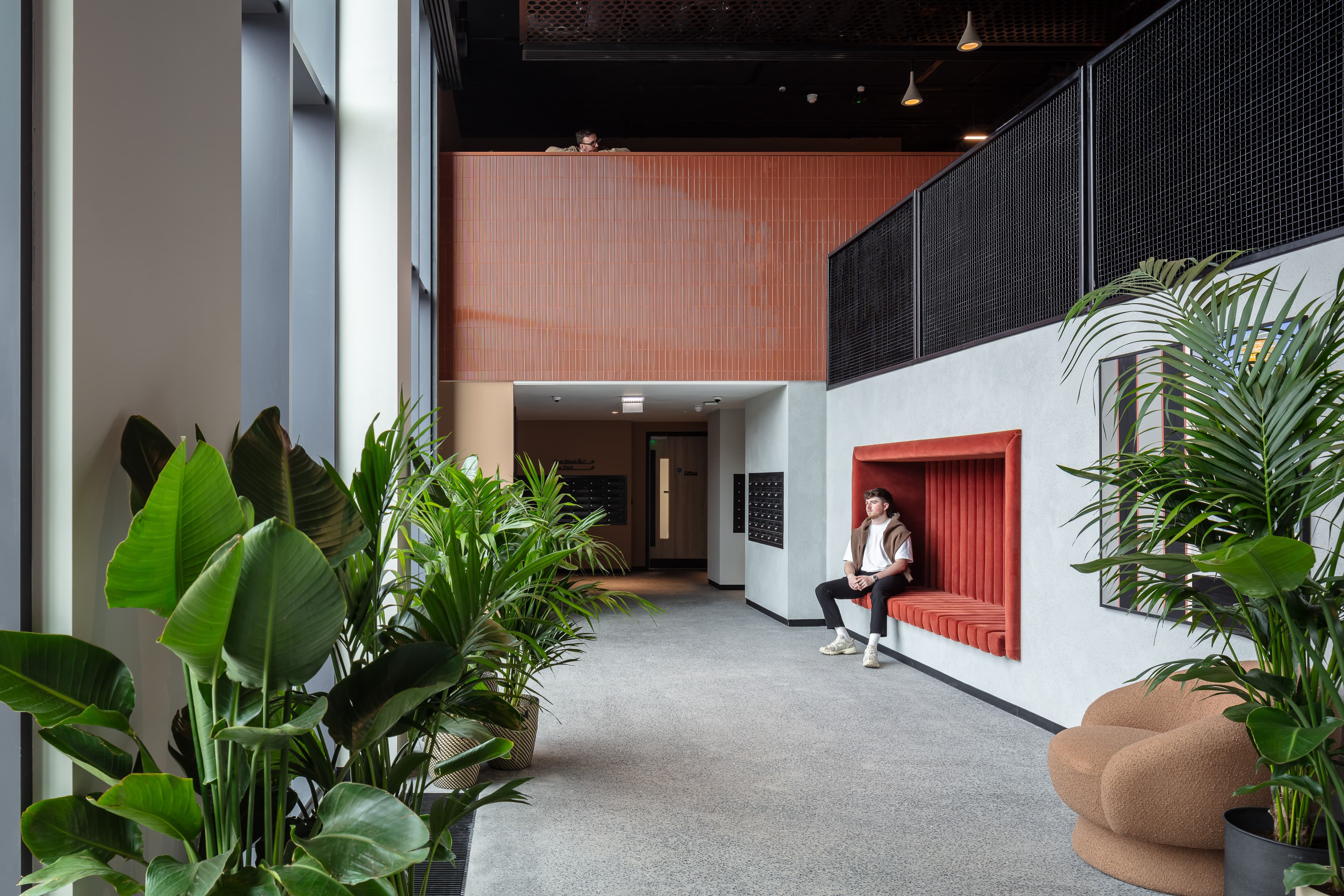 The design balances an urban aesthetic with durability and warmth. Robust materials like concrete floors, high-pressure laminates, stone, and tiles were paired with biophilic elements such as textured fabrics, canopy-inspired motifs, and abundant planting, resulting in a future-proof, humancentric environment with a certification of BREAAM Excellent.