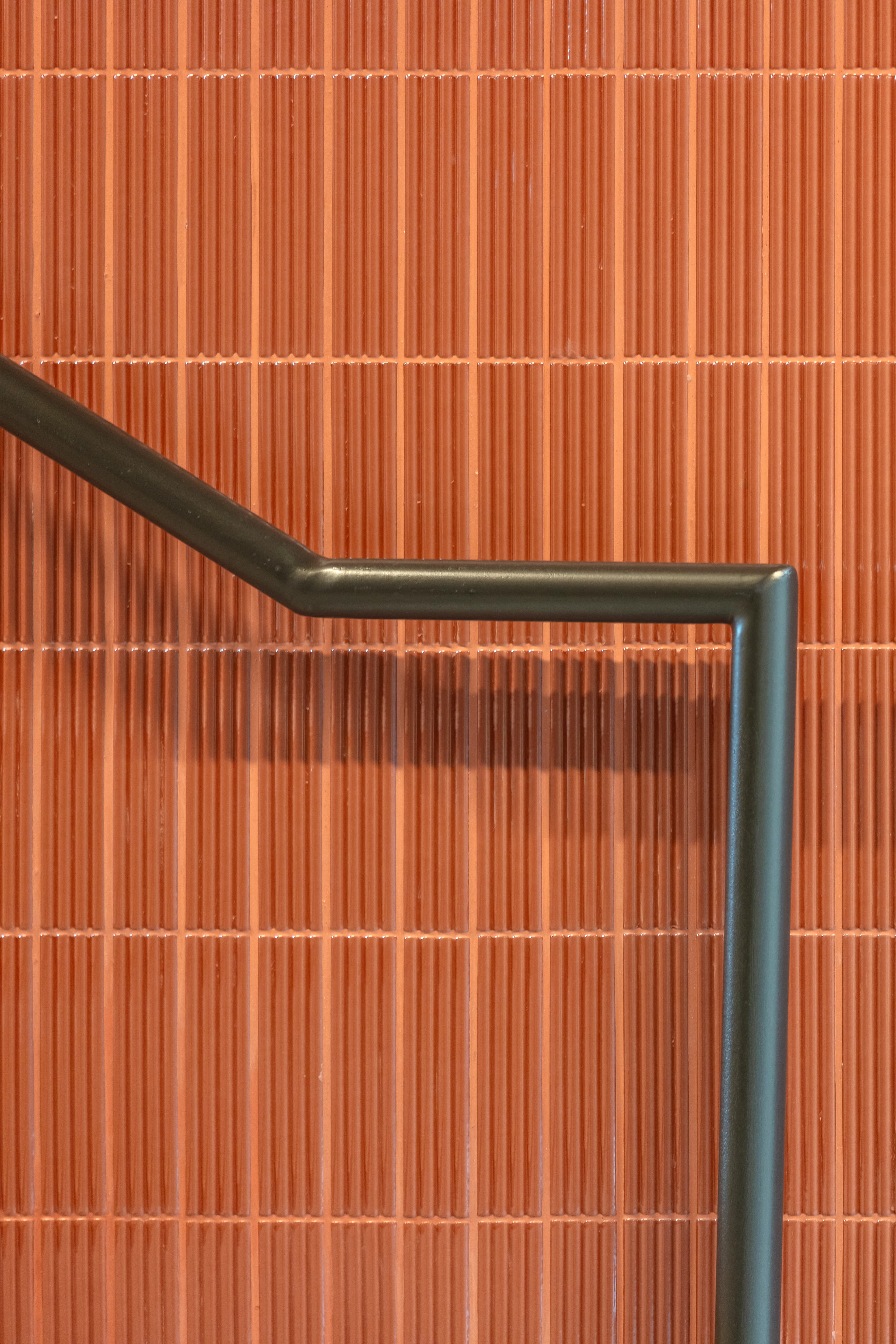Floor-to-ceiling columns, which might typically fragment the space, have been reimagined. These columns flare toward the ceiling, echoing traditional mushroom forms while incorporating materials tailored to each setting. In the café, reflective bronze cladding enlivens the sculpted uprights; in the gym, raw concrete reinforces a sense of strength and resilience; and in the co-working space, light oak fosters a tranquil atmosphere, promoting focus and productivity.