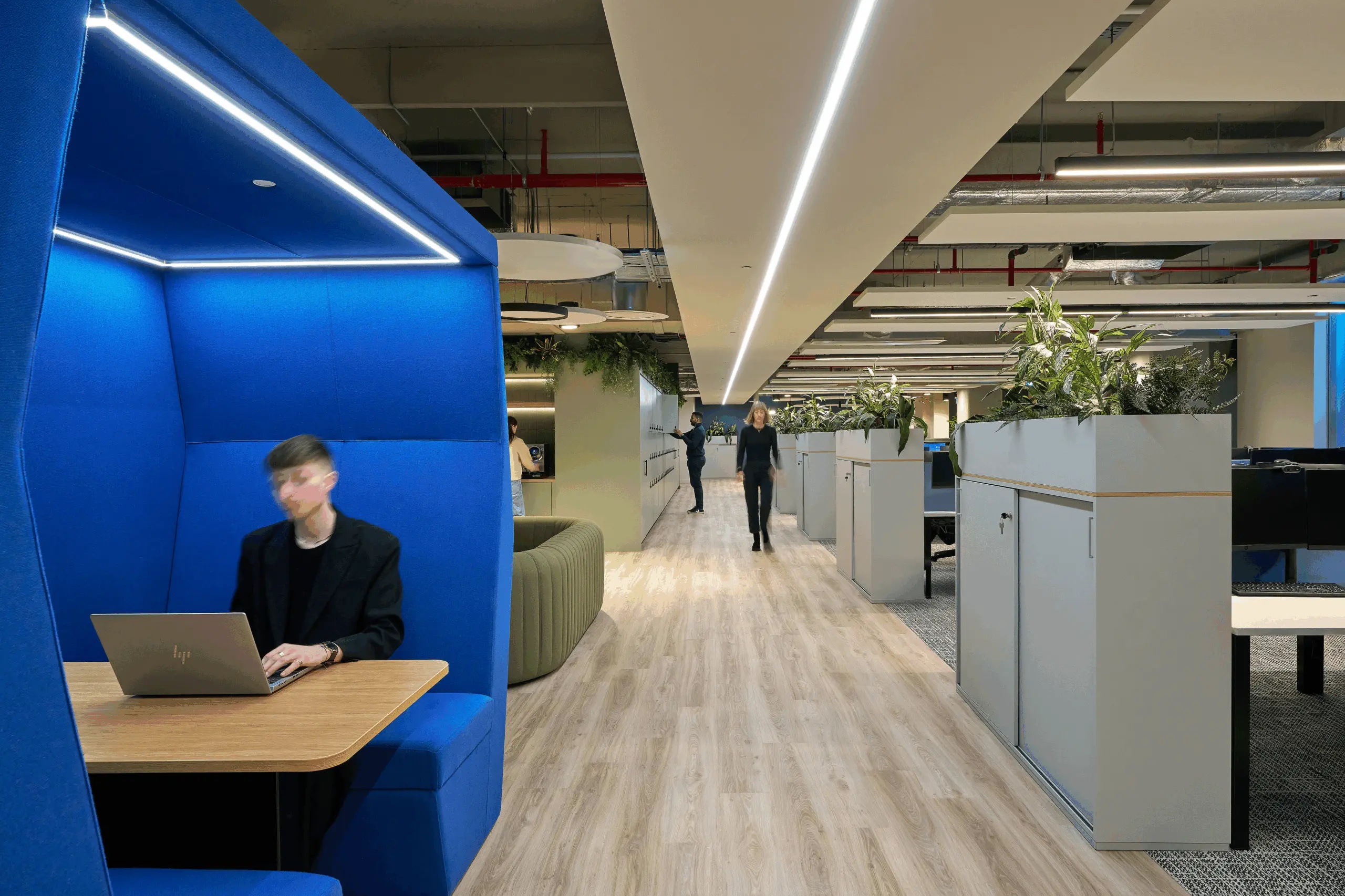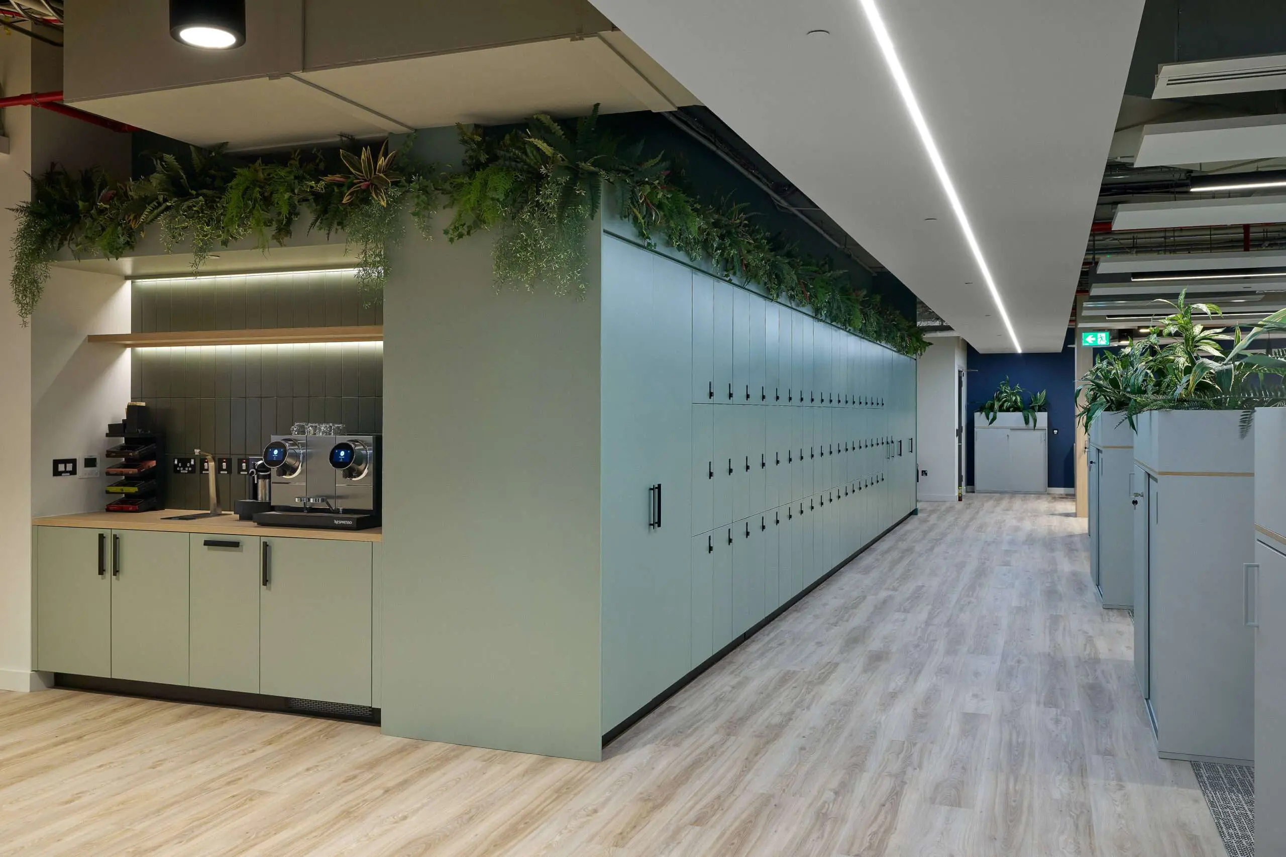Key to this transformation was the incorporation of biophilic design principles, enhancing wellbeing through natural elements such as integrated planting, warm natural finishes, and improved acoustics. A calm and welcoming atmosphere was achieved using a natural colour palette aligned with brand guidelines, creating a cohesive and professional environment. The completed office successfully balances functionality, aesthetics, and brand alignment.