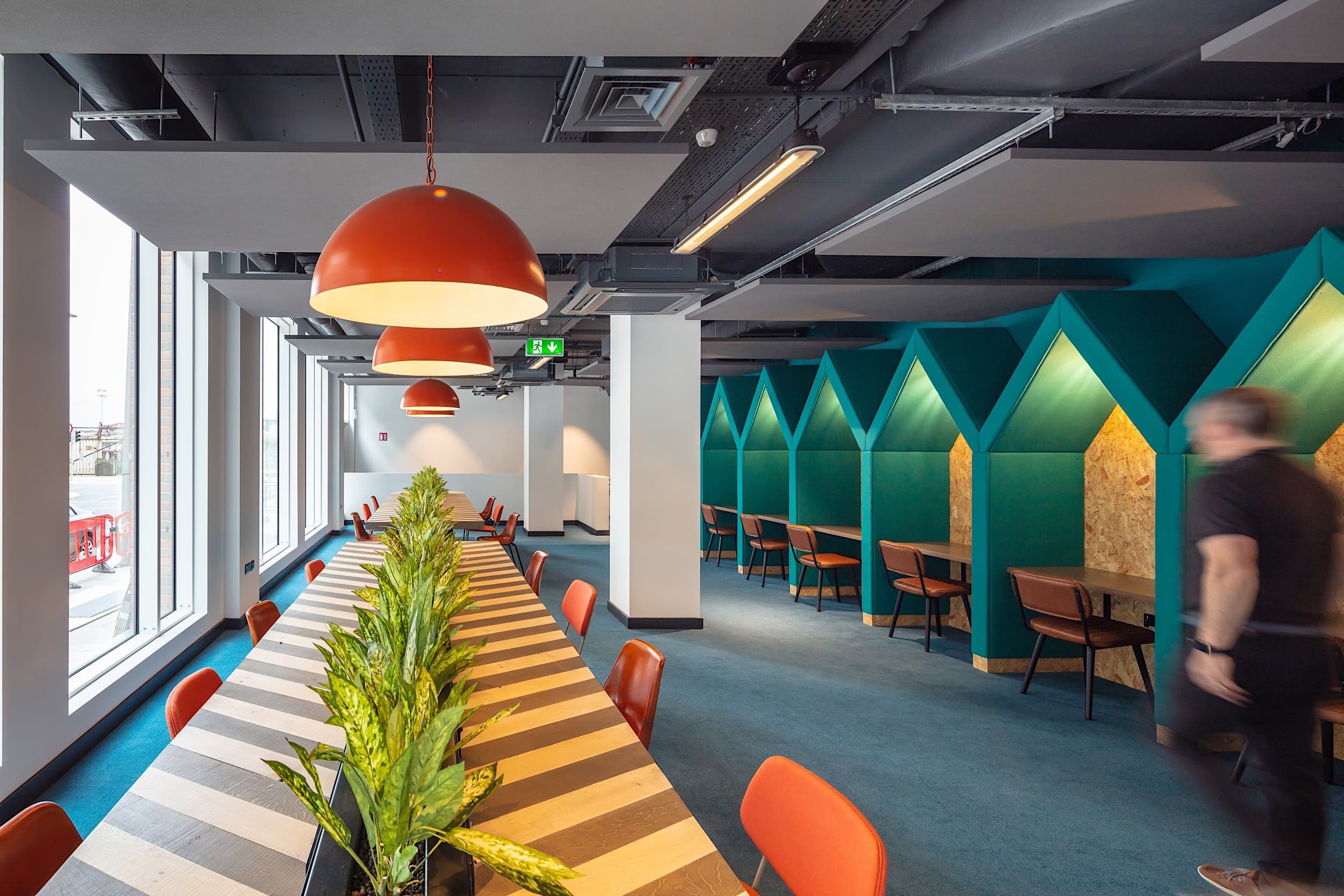 Both buildings feature main hubs in their reception areas, equipped with gaming zones, TVs, gaming pods, a feature food truck, group seating, and small breakout spaces. The open-plan layout is versatile, accommodating events and daily activities. Connected to these hubs are ’Seating Huts’, offering quieter, private spaces for individuals or small groups.