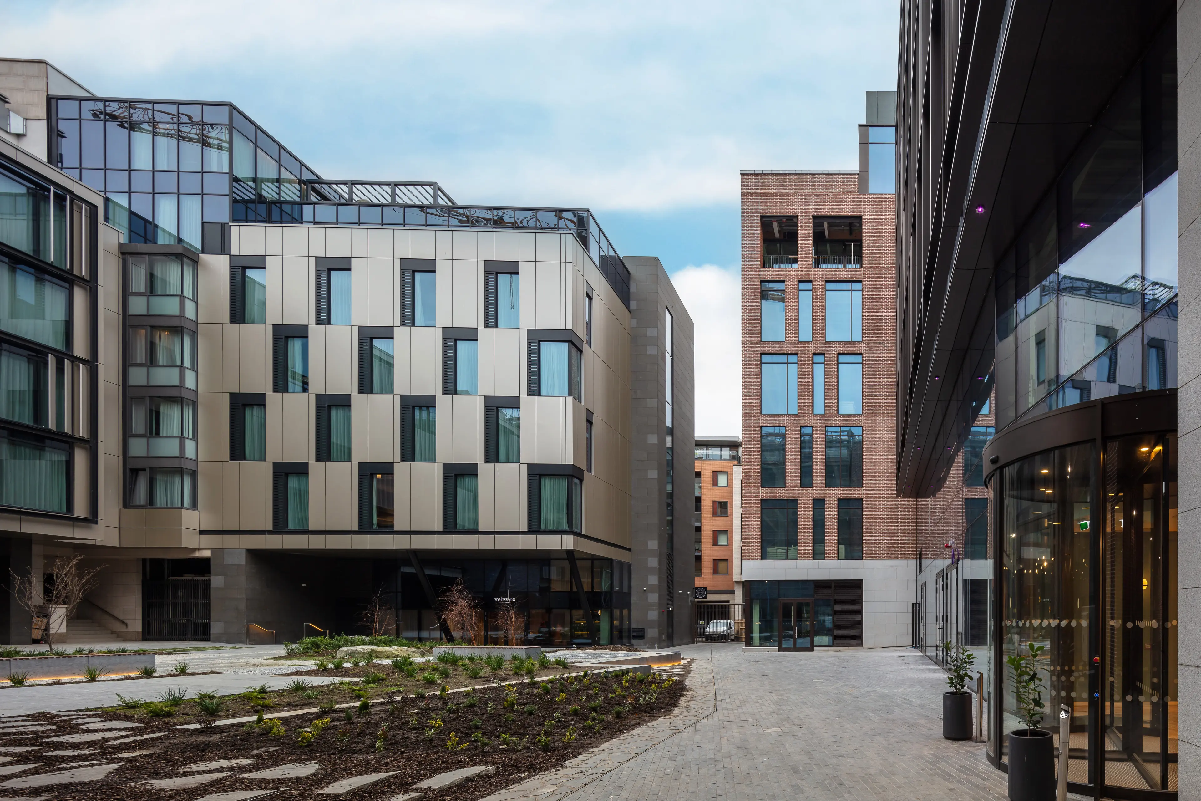 Building heights range from 6 to 10 storeys and sit comfortably within the streetscape through a tiering of the upper levels. The project is the second phase of the development to the rear of the Radisson Hotel on Golden Lane which forms a new civic square on the site of Dublin’s earliest Christian church, 6th century Michael Le Pole Church and graveyard.