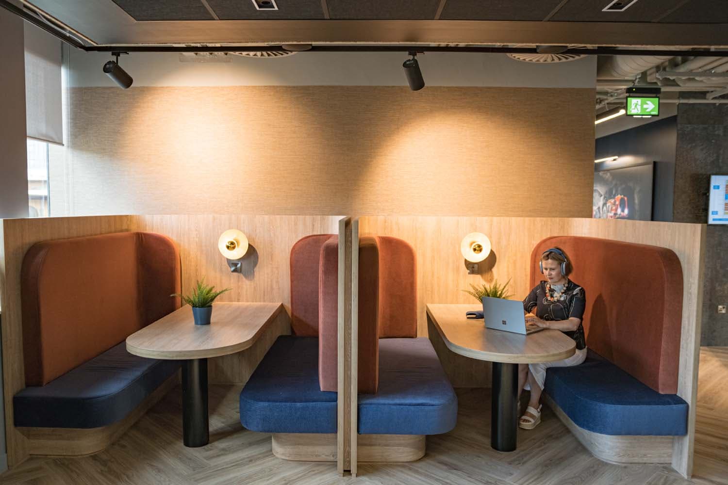An activity-based working environment designed to accommodate 150 Sandvik staff at 50% occupancy within 1,200 sqm of office space at Dockline, Dublin 1.