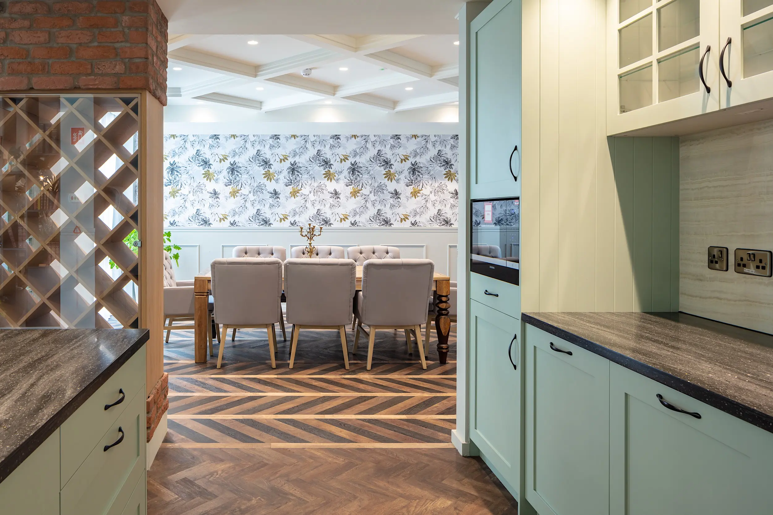 The scale of the home was intentionally reduced to create a more domestic feel by zoning each area with its own unique identity, reminiscent of a large country estate. Wings were aptly named the Conservatory, Pantry, Drawing Room, and Ballroom, each designed with a modern interpretation of these historical spaces. This design approach also provided intuitive wayfinding, making the building more familiar and comforting for residents.