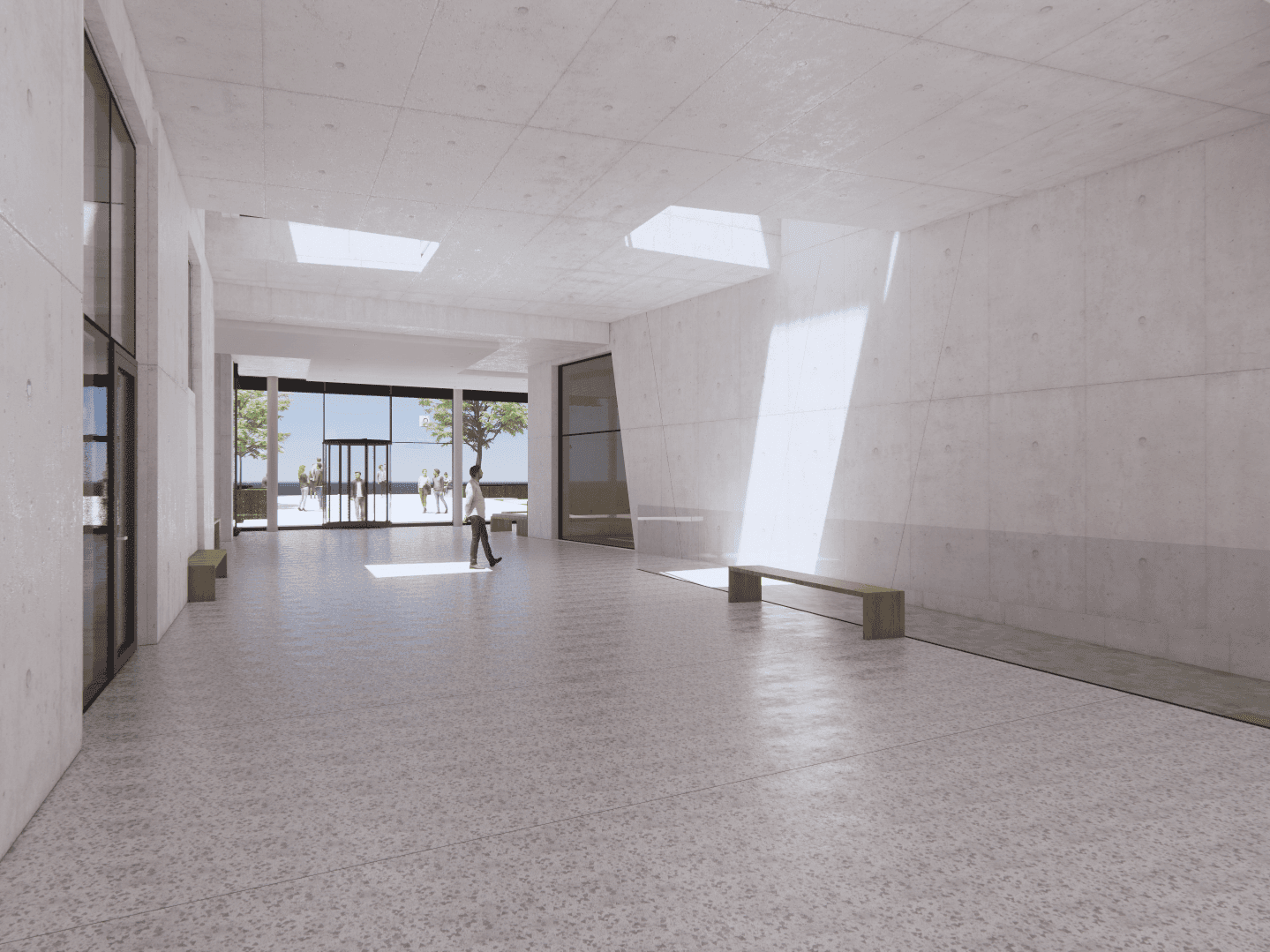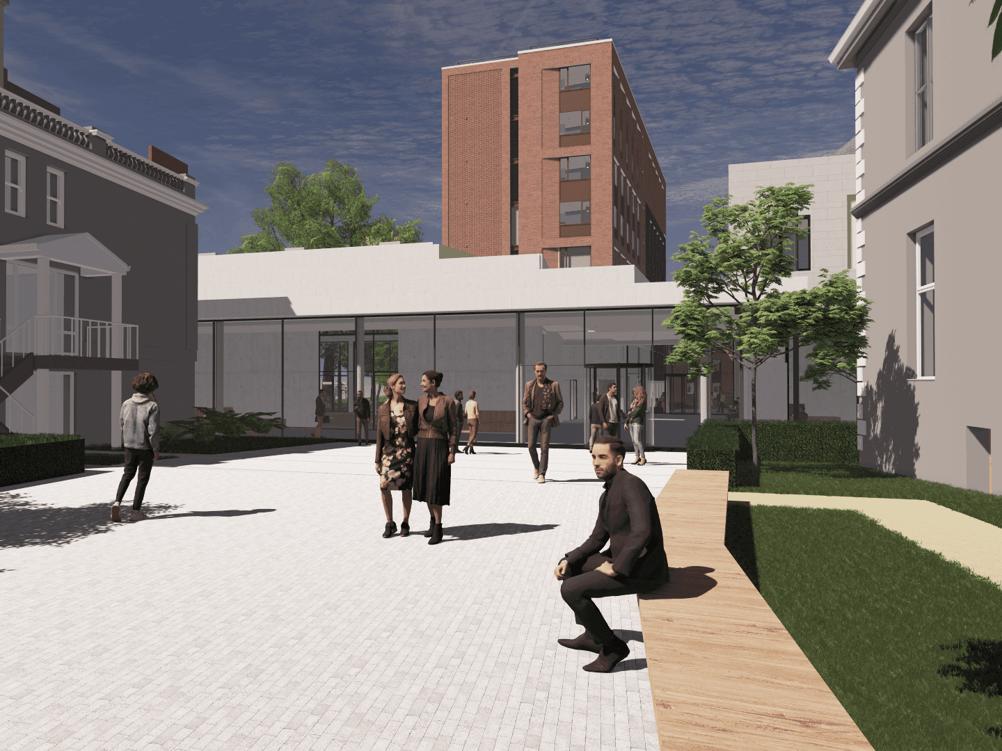 The forum space creates a new east-west axis through the site, linking the proposed residential courtyard with the existing plaza and pedestrian gate to the west. Outdoor amenity spaces are provided within the central courtyard together with enhanced public realm works, landscaping, bicycle parking and a single storey security hut.